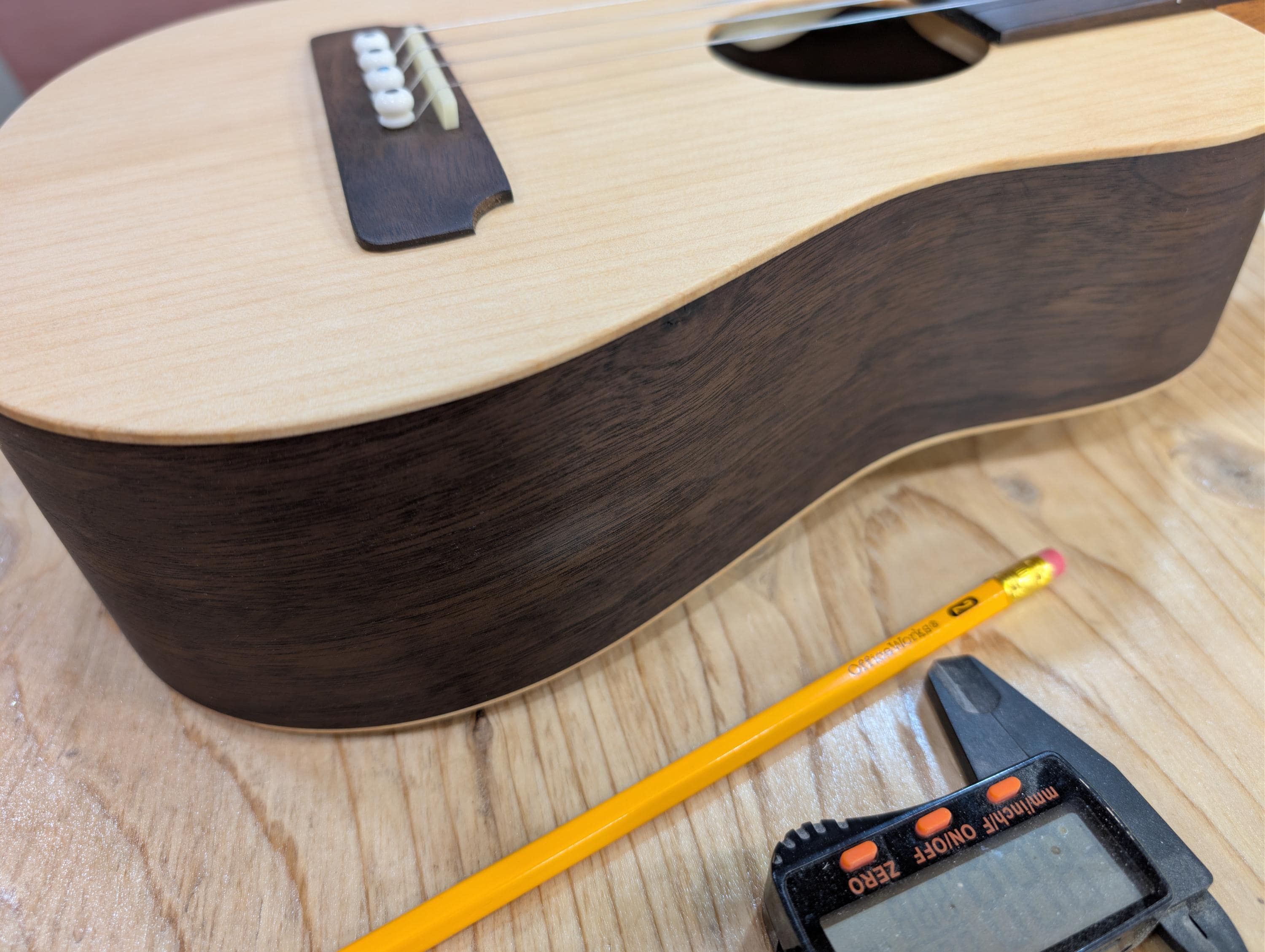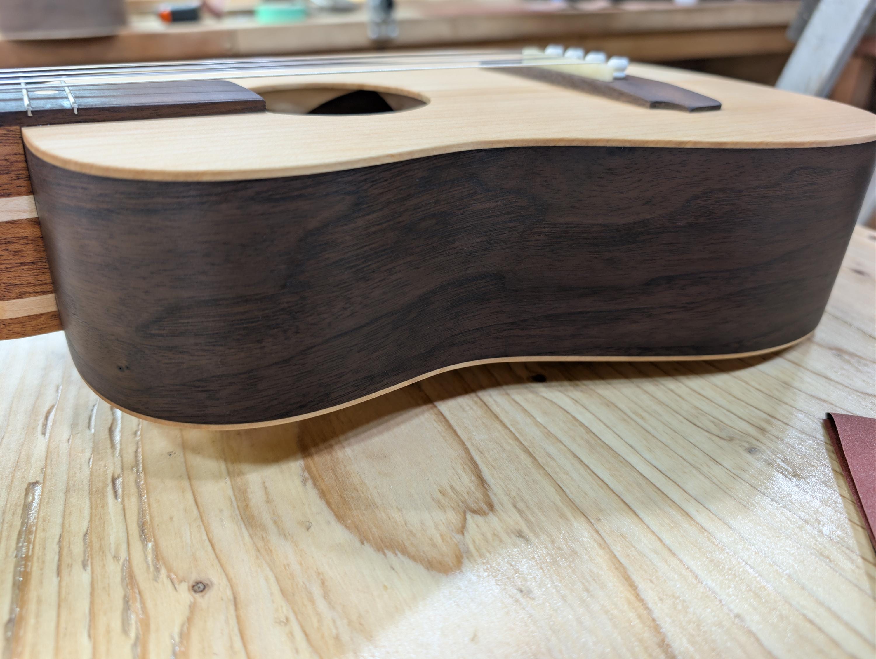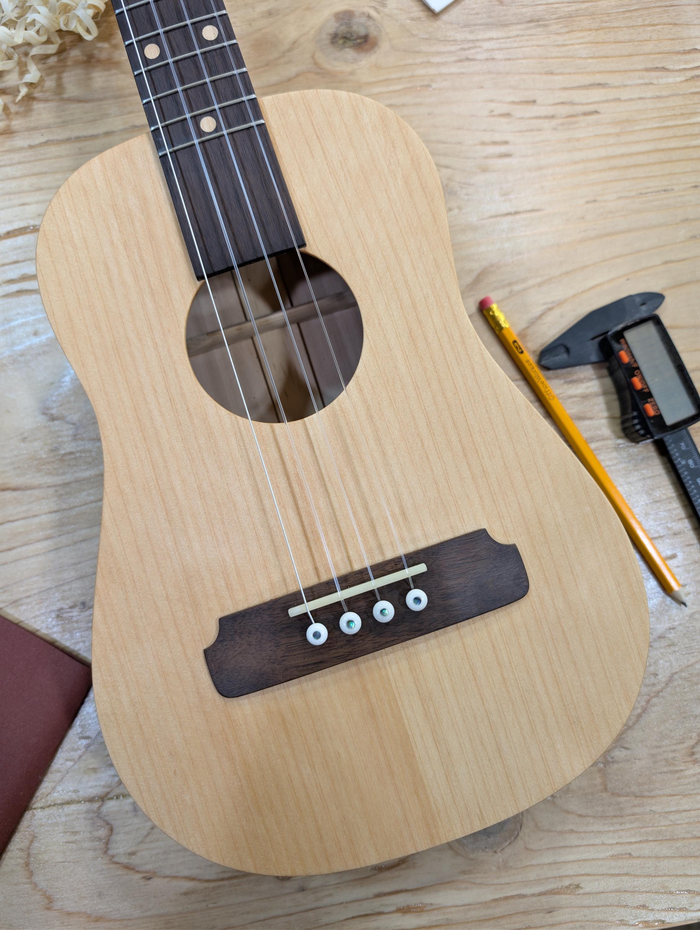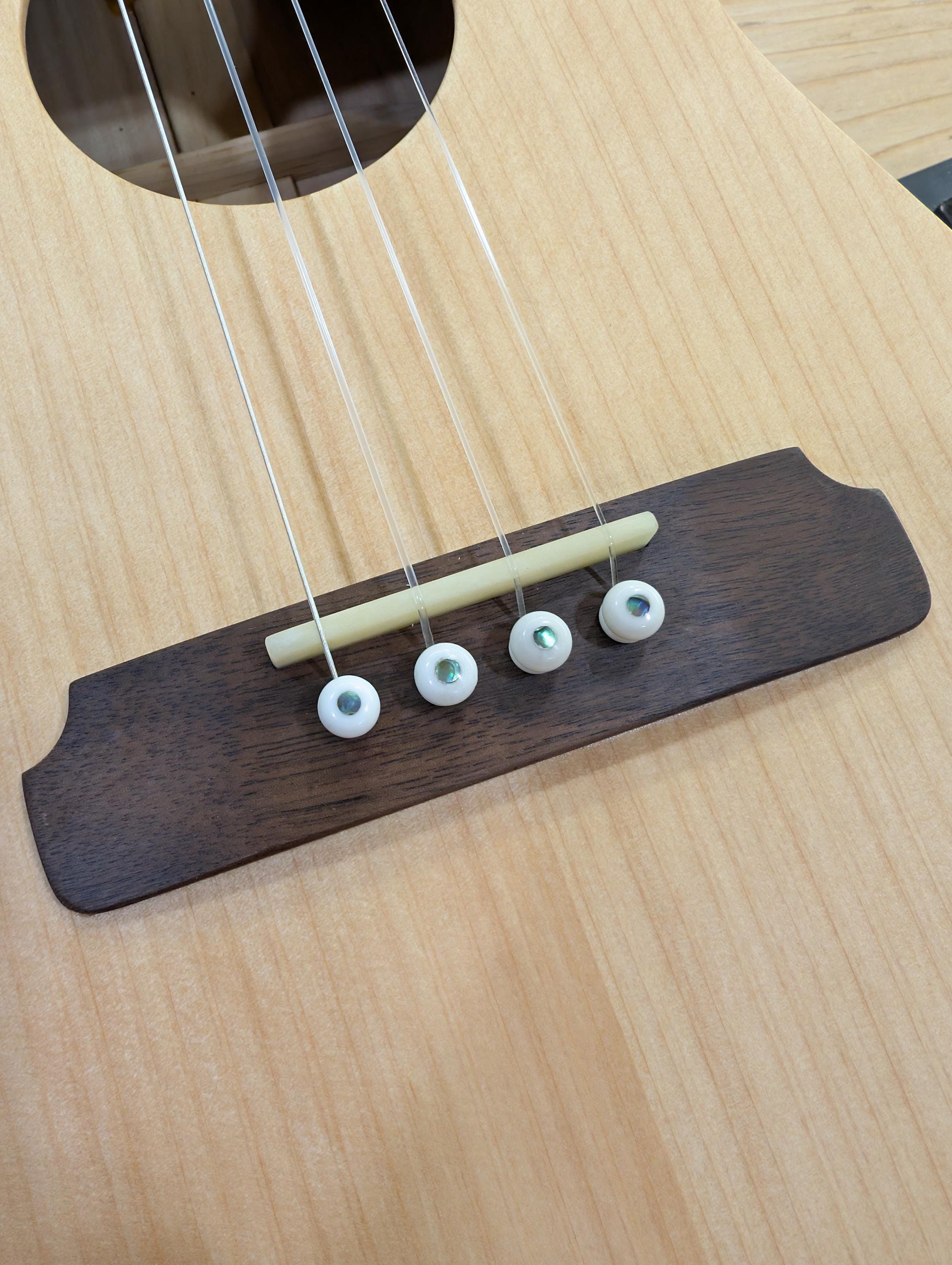 Top wood : Port Orford Cedar Back wood : Port Orford Cedar Sides : Black Walnut Fretboard : Black Walnut with Maple fret dots Bridge : Black Walnut nut width : 1.46" width at 12th fret : 1.71" string spacing at nut : .375" scale length: 17" nut and saddle are unbleached bone bridge pins are bone with inlays golden gate tuning machines D'Addario clear nylon low G strings