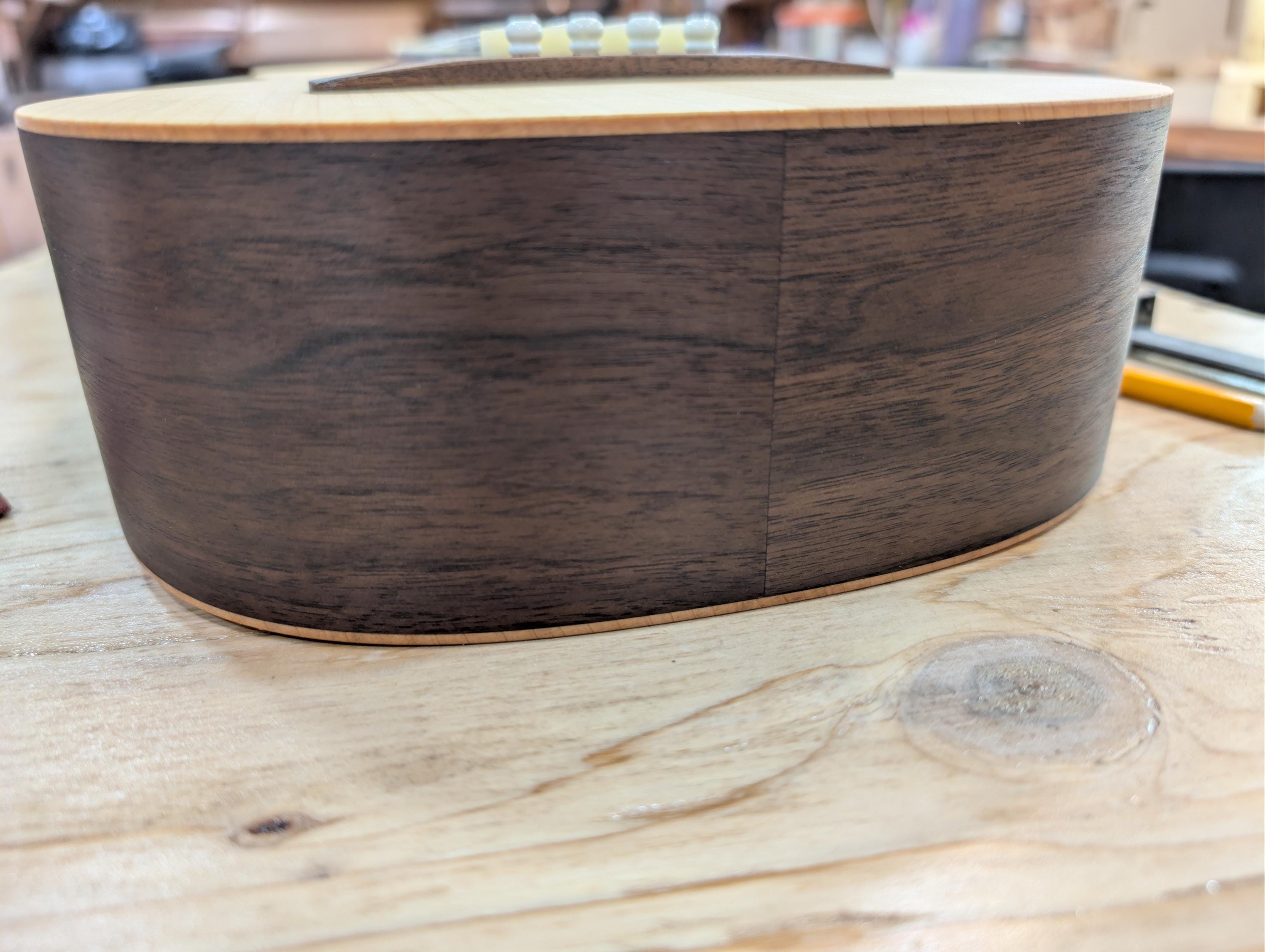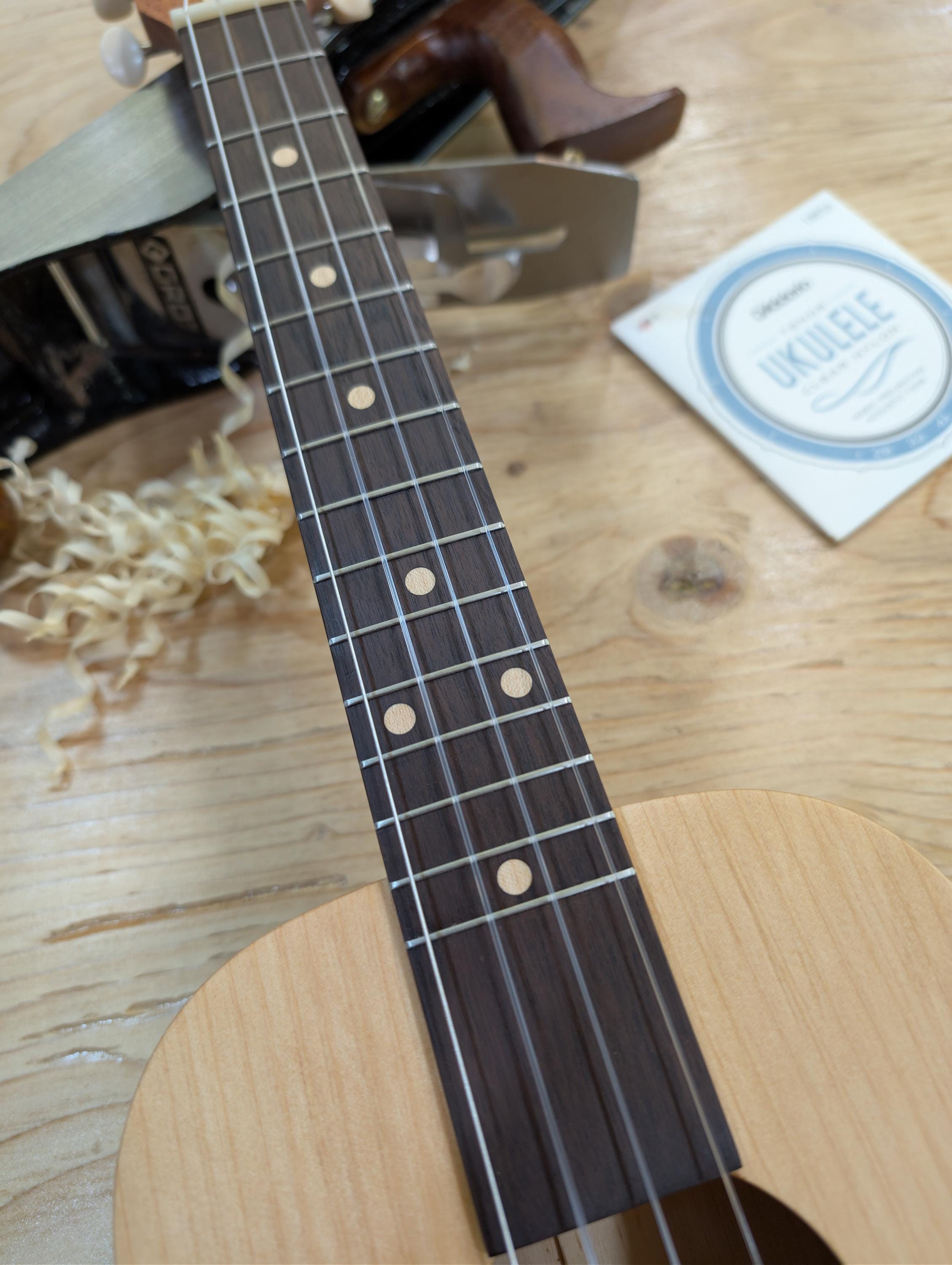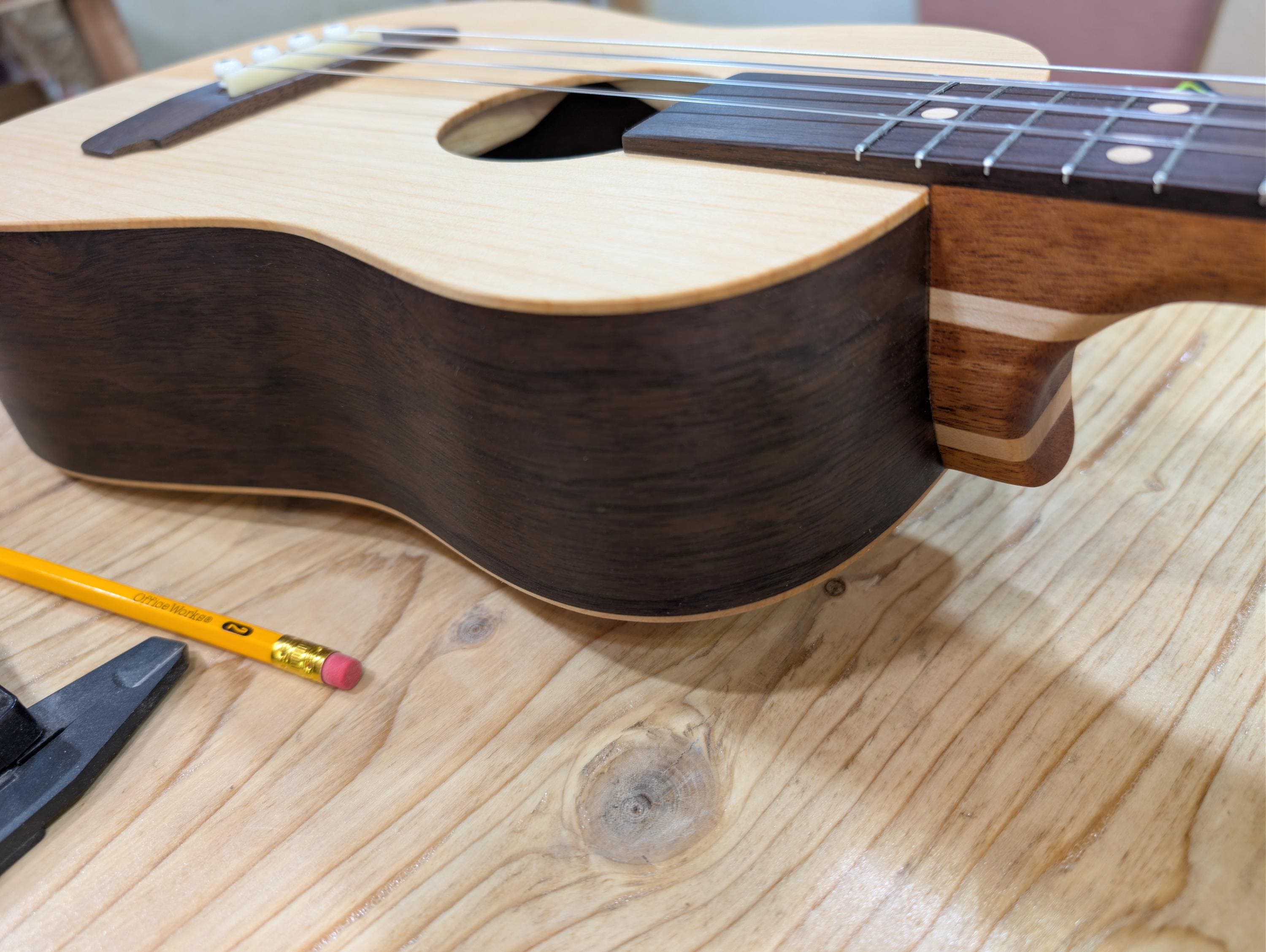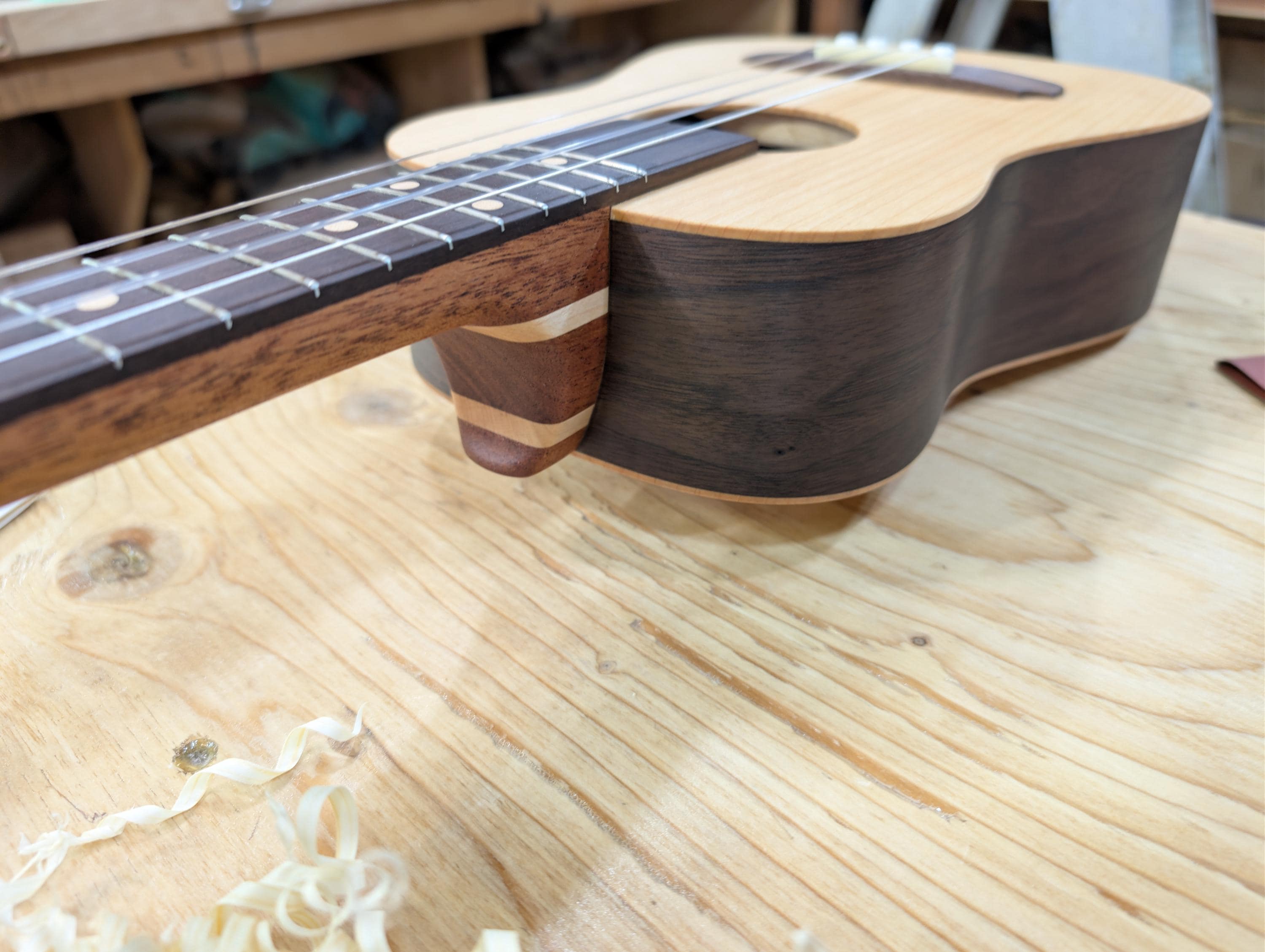 Top wood : Port Orford Cedar Back wood : Port Orford Cedar Sides : Black Walnut Fretboard : Black Walnut with Maple fret dots Bridge : Black Walnut nut width : 1.46" width at 12th fret : 1.71" string spacing at nut : .375" scale length: 17" nut and saddle are unbleached bone bridge pins are bone with inlays golden gate tuning machines D'Addario clear nylon low G strings