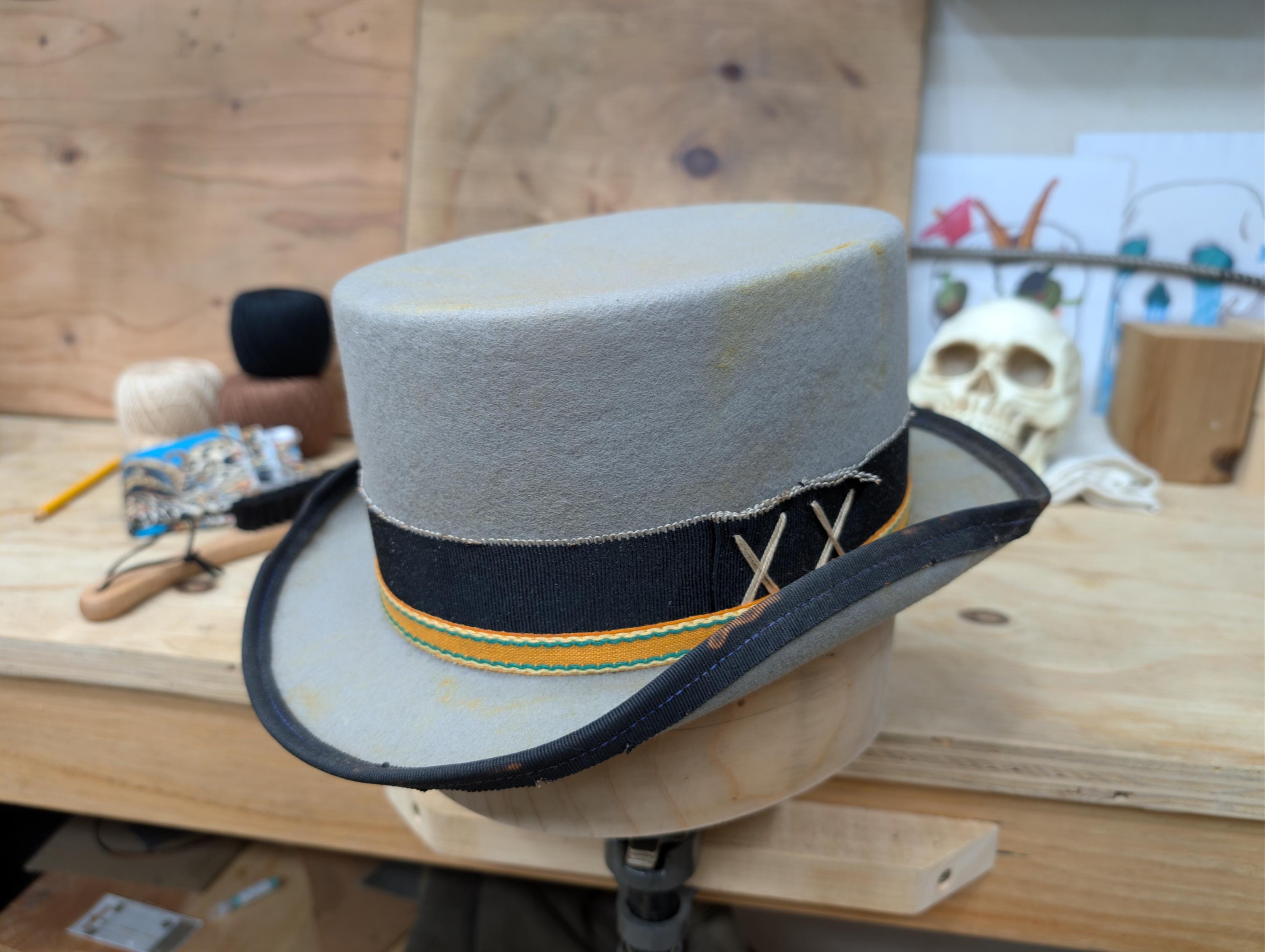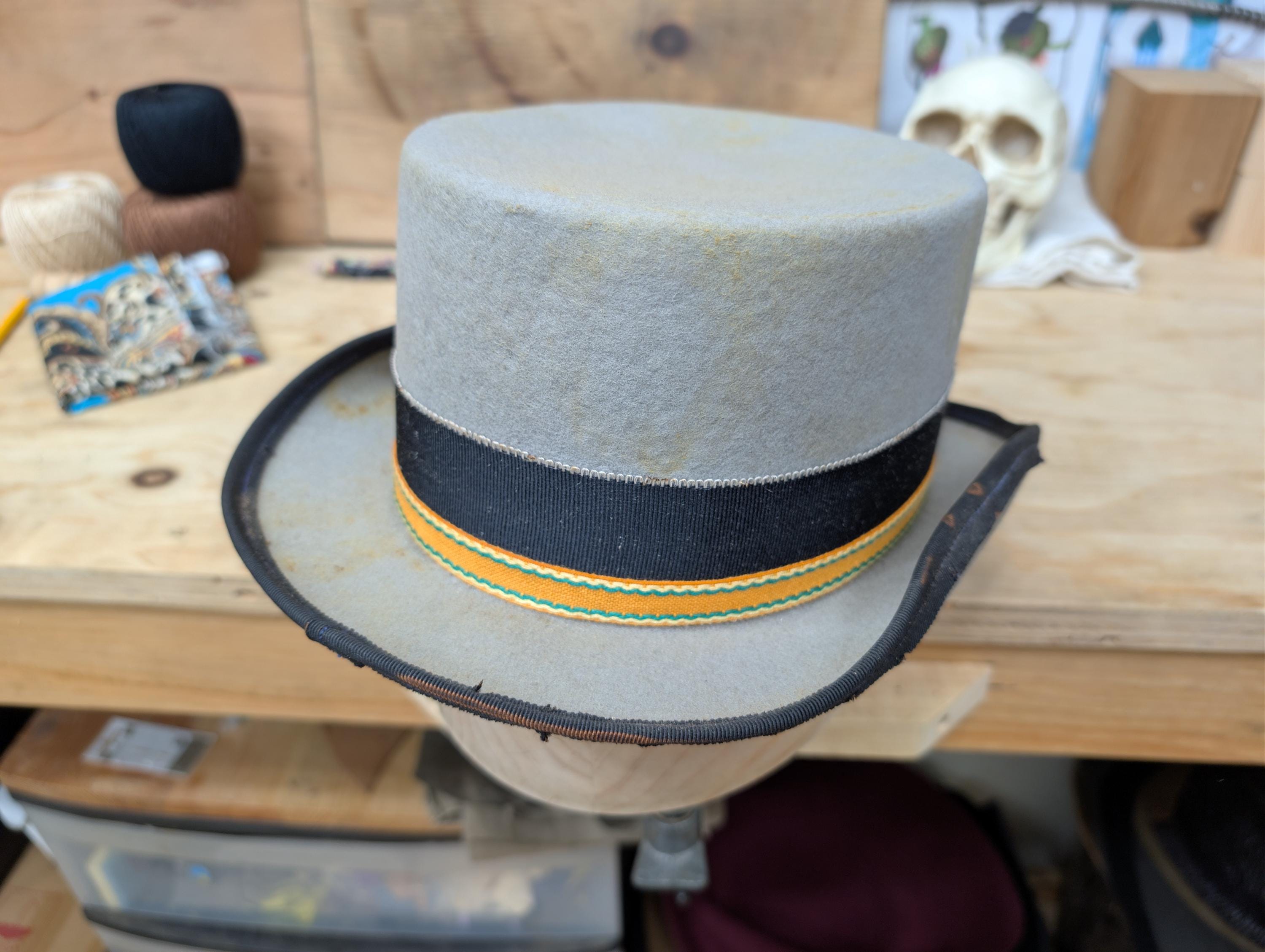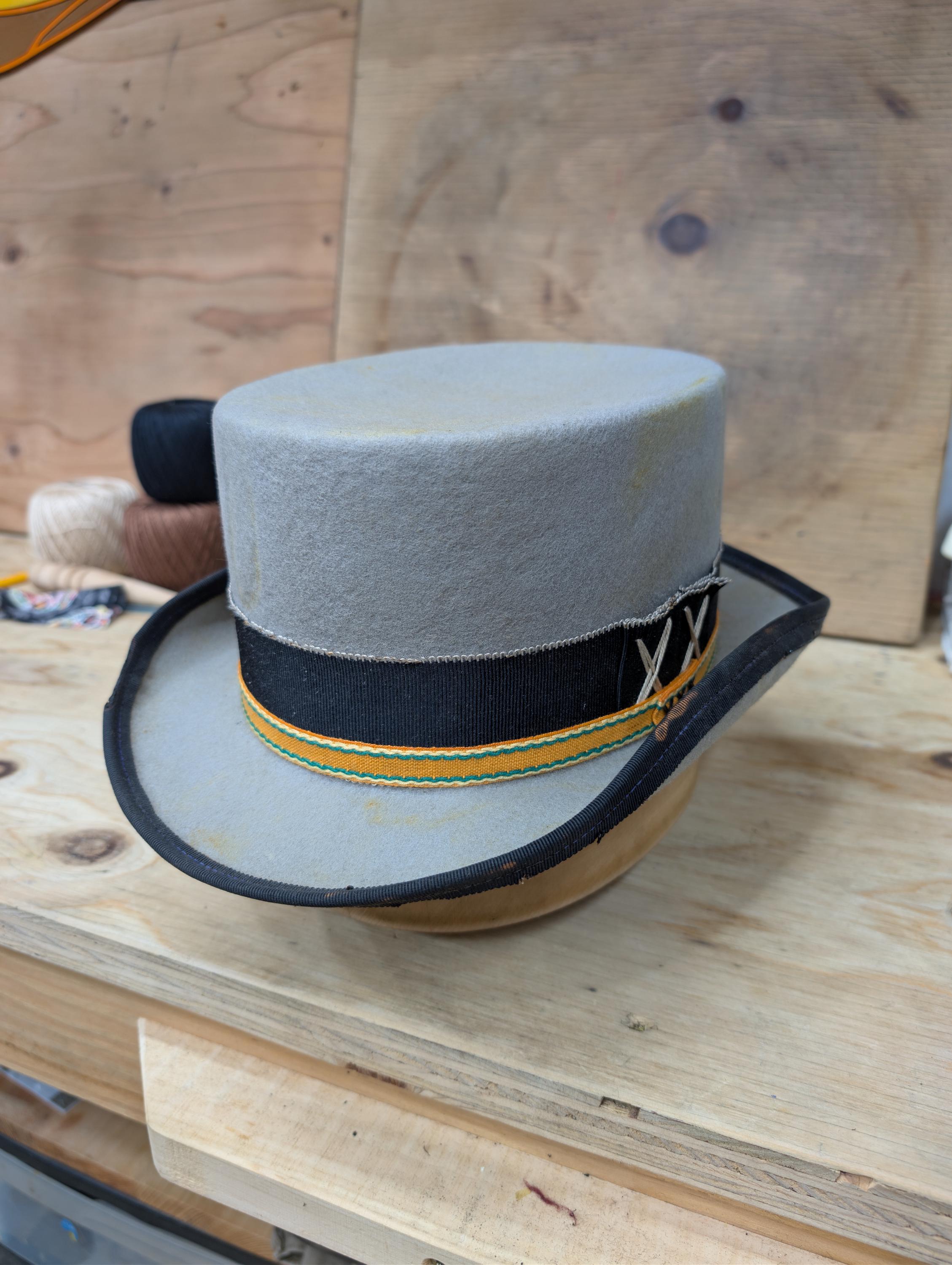 https://www.youtube.com/@hurleyhatworksMy "Top Gambler" hat in grey. Thick wool felt hand blocked hand shaped by me. Linen petersham ribbon and some vintage orange cotton ribbon for the hat band. Lamb leather inner sweatband with a cotton liner. The crown height is 4 3/8" and the brim is 1 7/8".