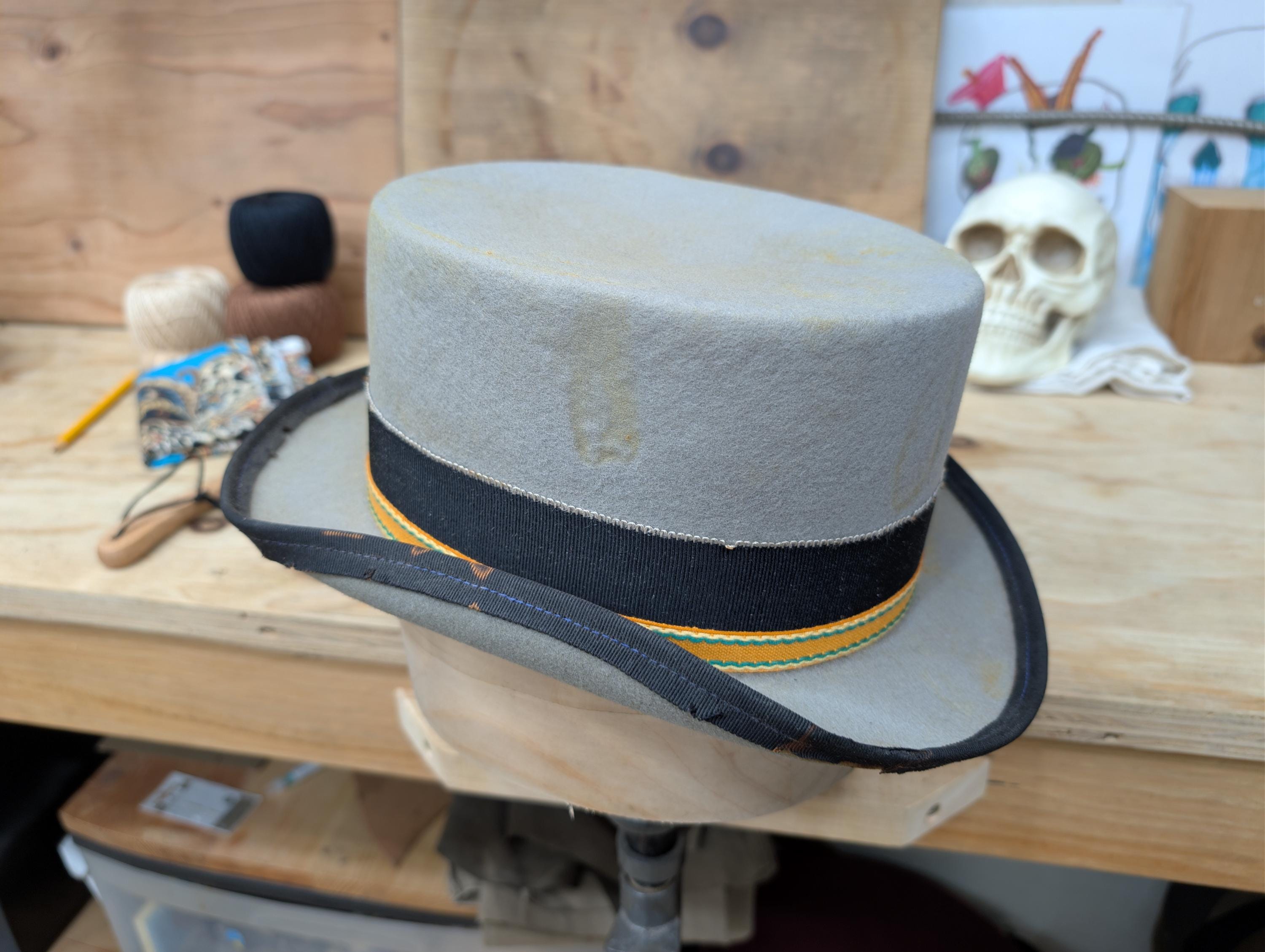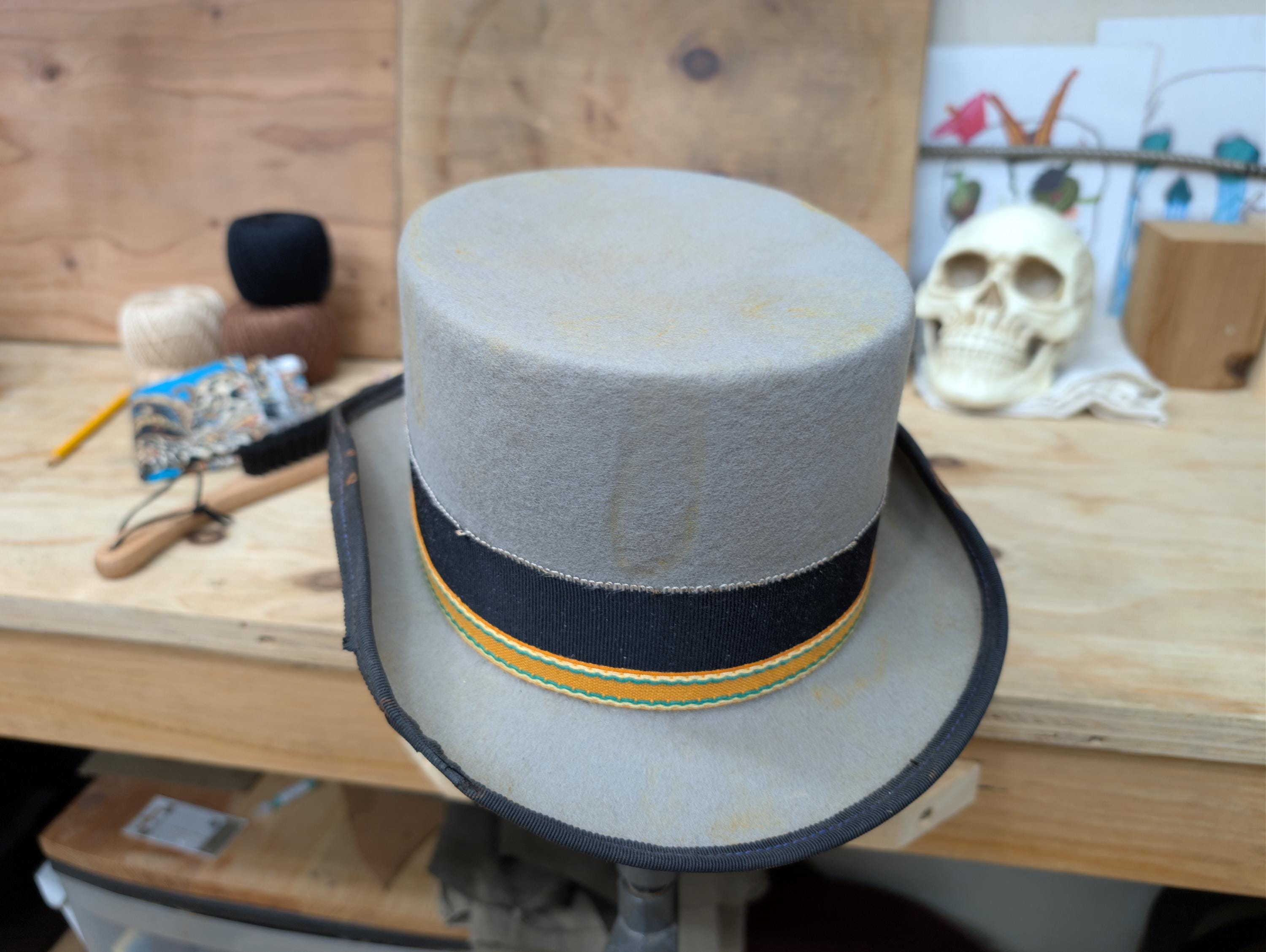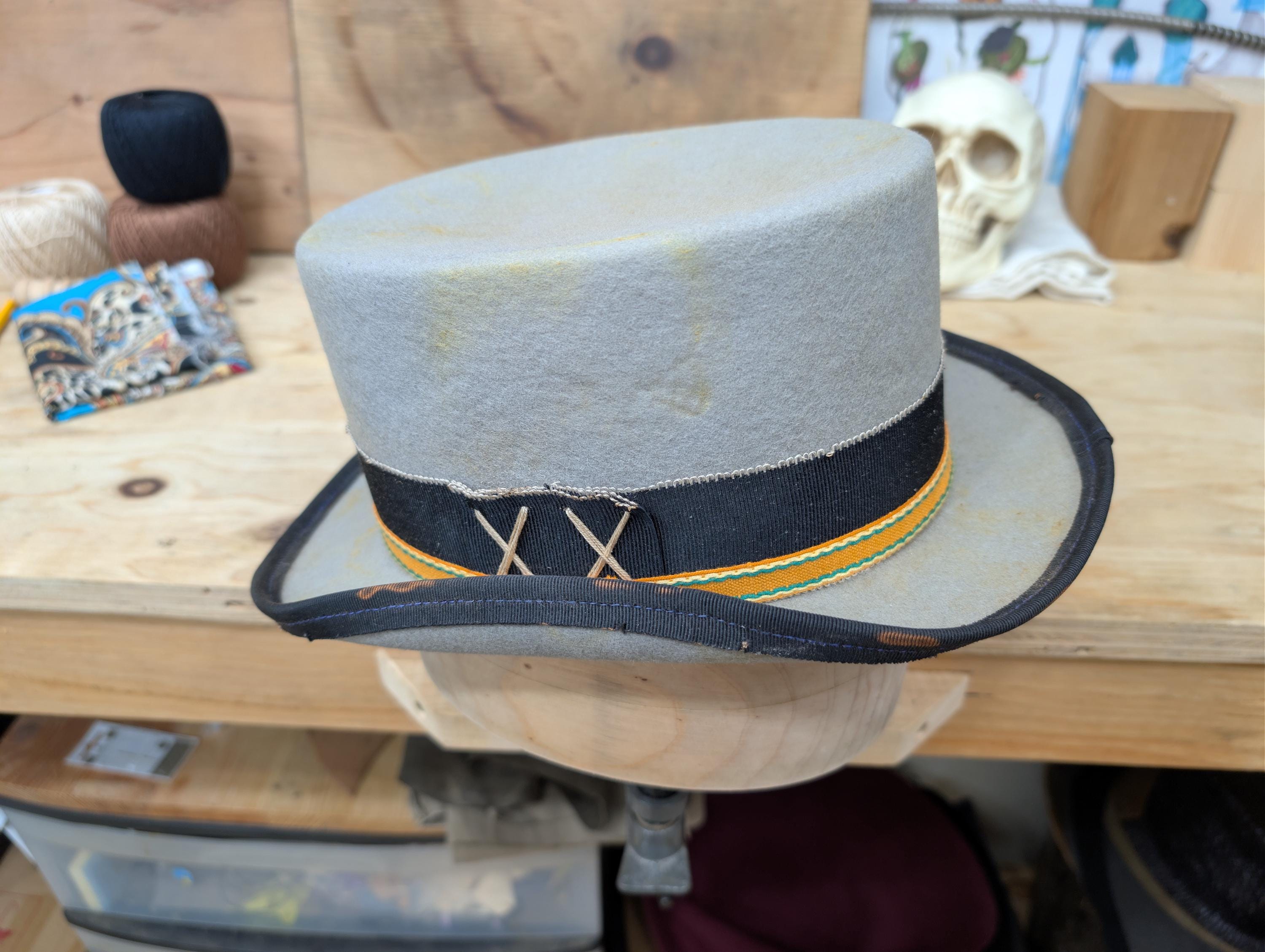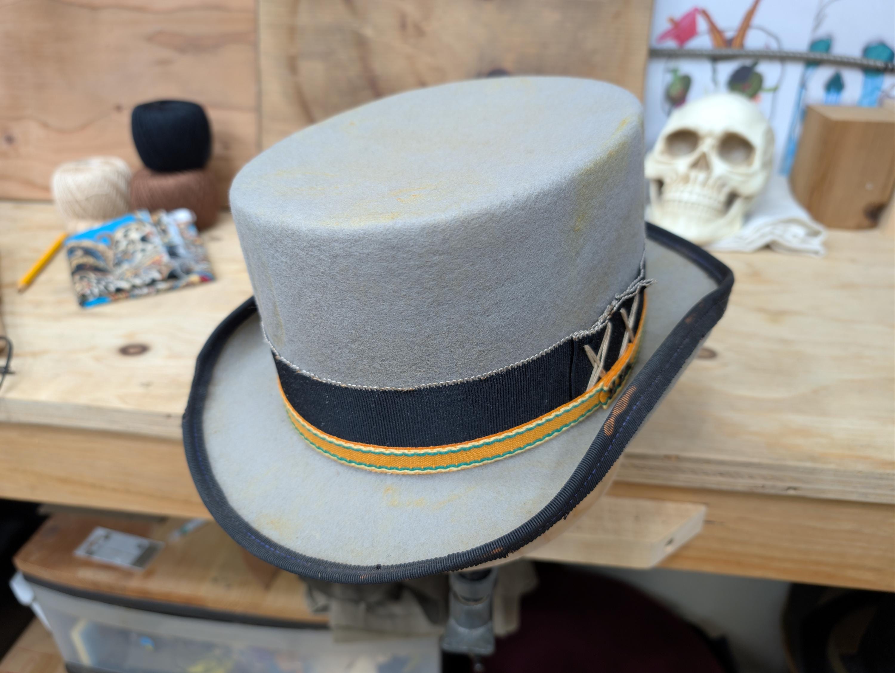 https://www.youtube.com/@hurleyhatworksMy "Top Gambler" hat in grey. Thick wool felt hand blocked hand shaped by me. Linen petersham ribbon and some vintage orange cotton ribbon for the hat band. Lamb leather inner sweatband with a cotton liner. The crown height is 4 3/8" and the brim is 1 7/8".