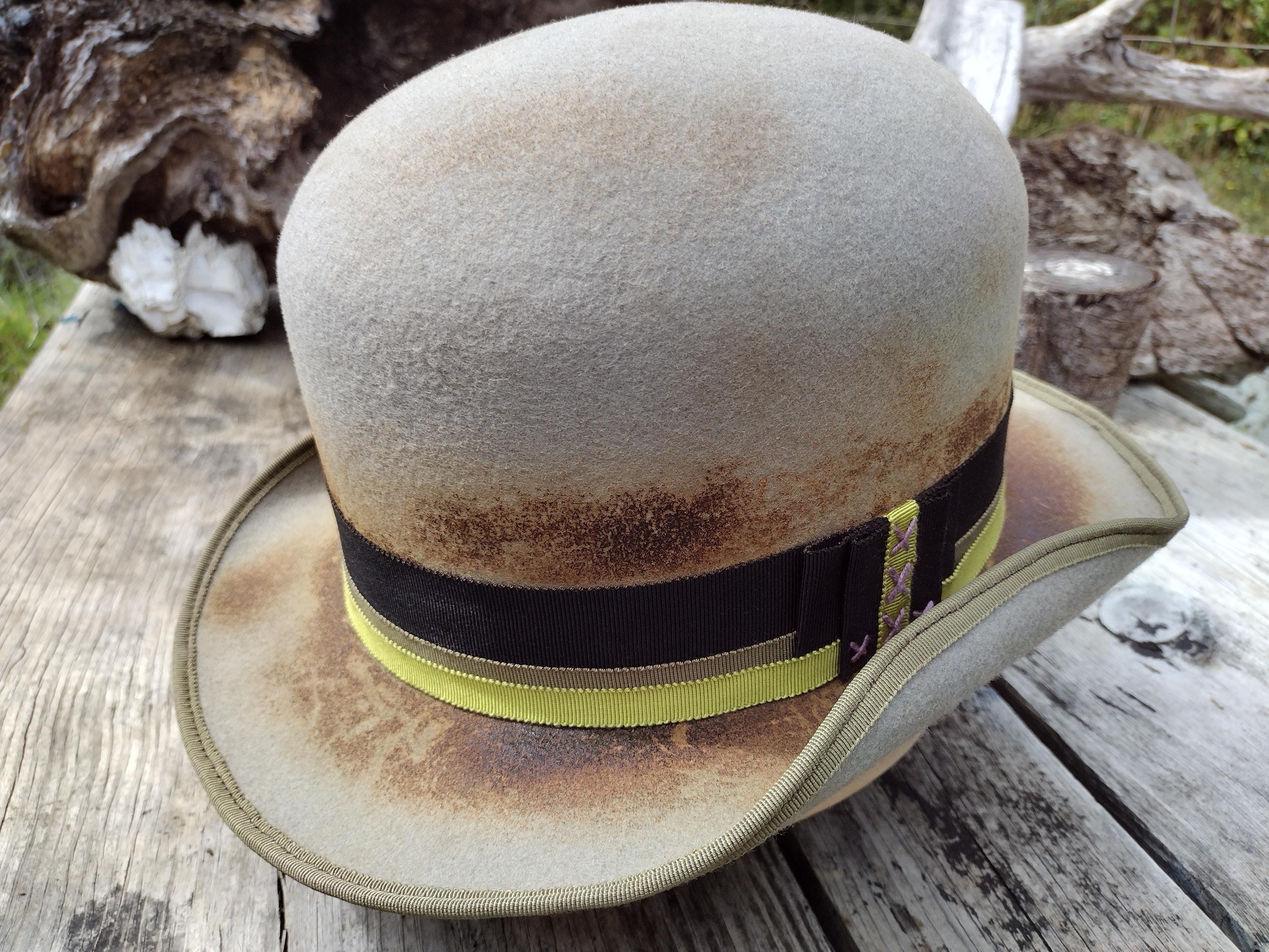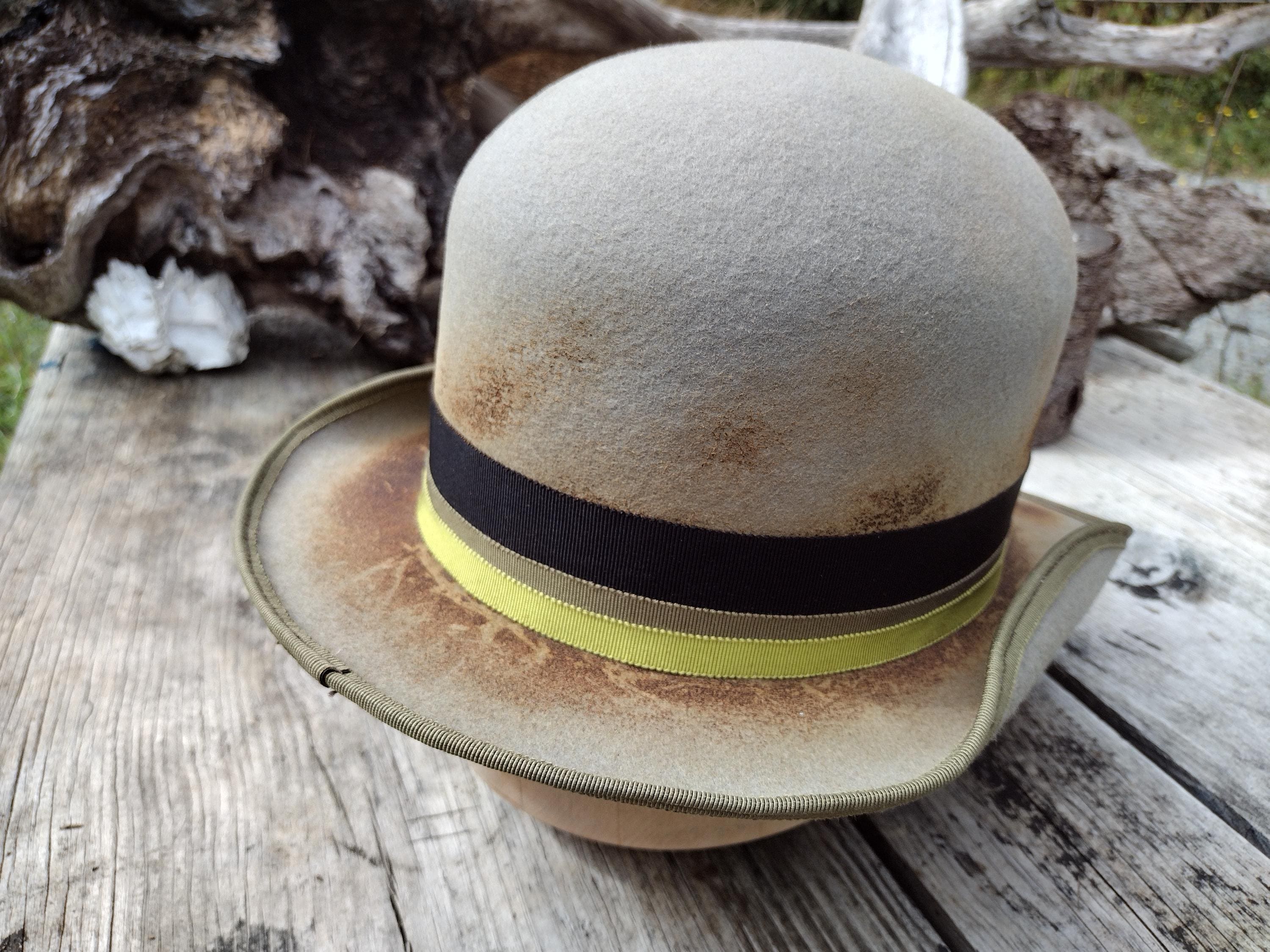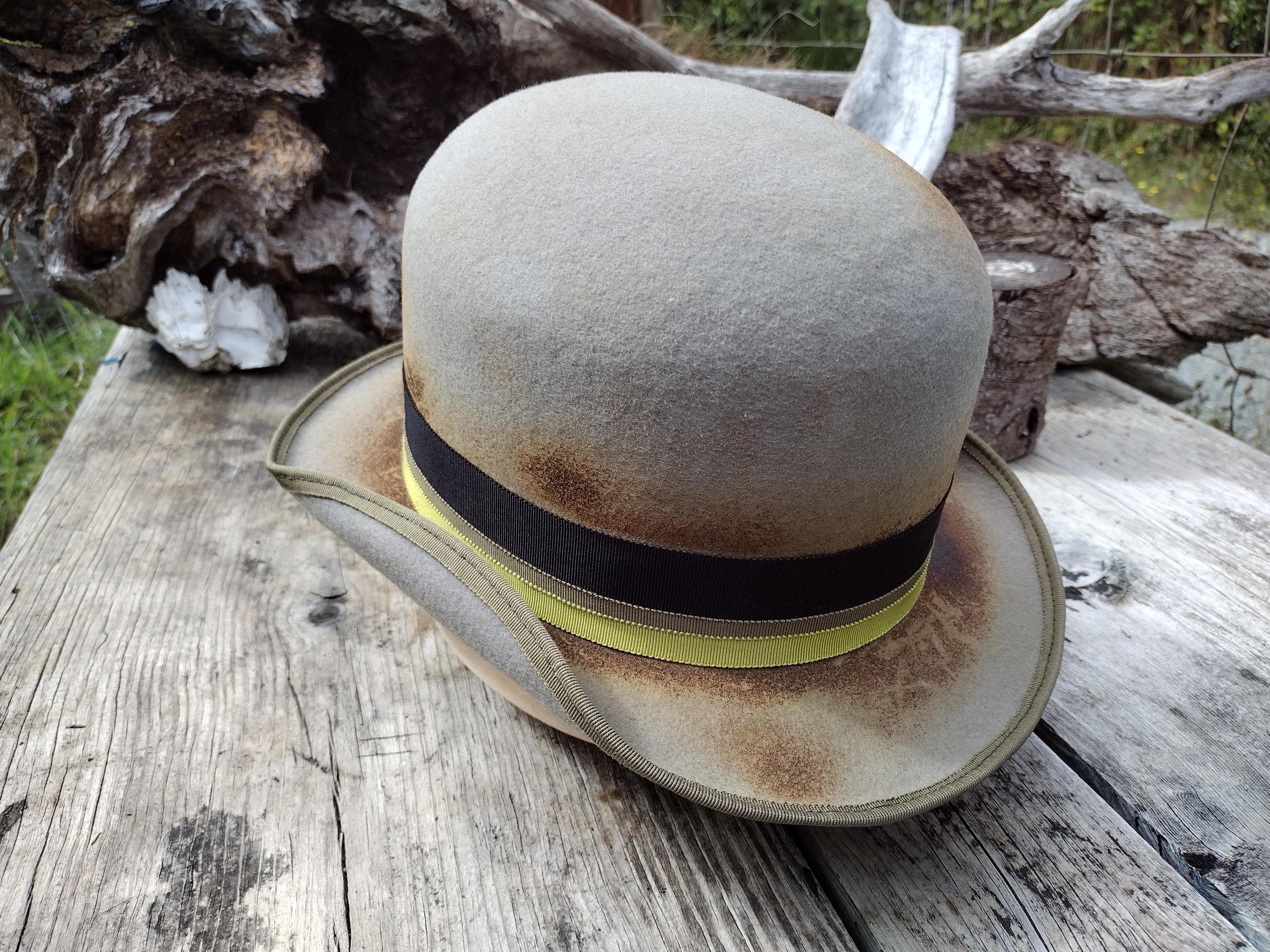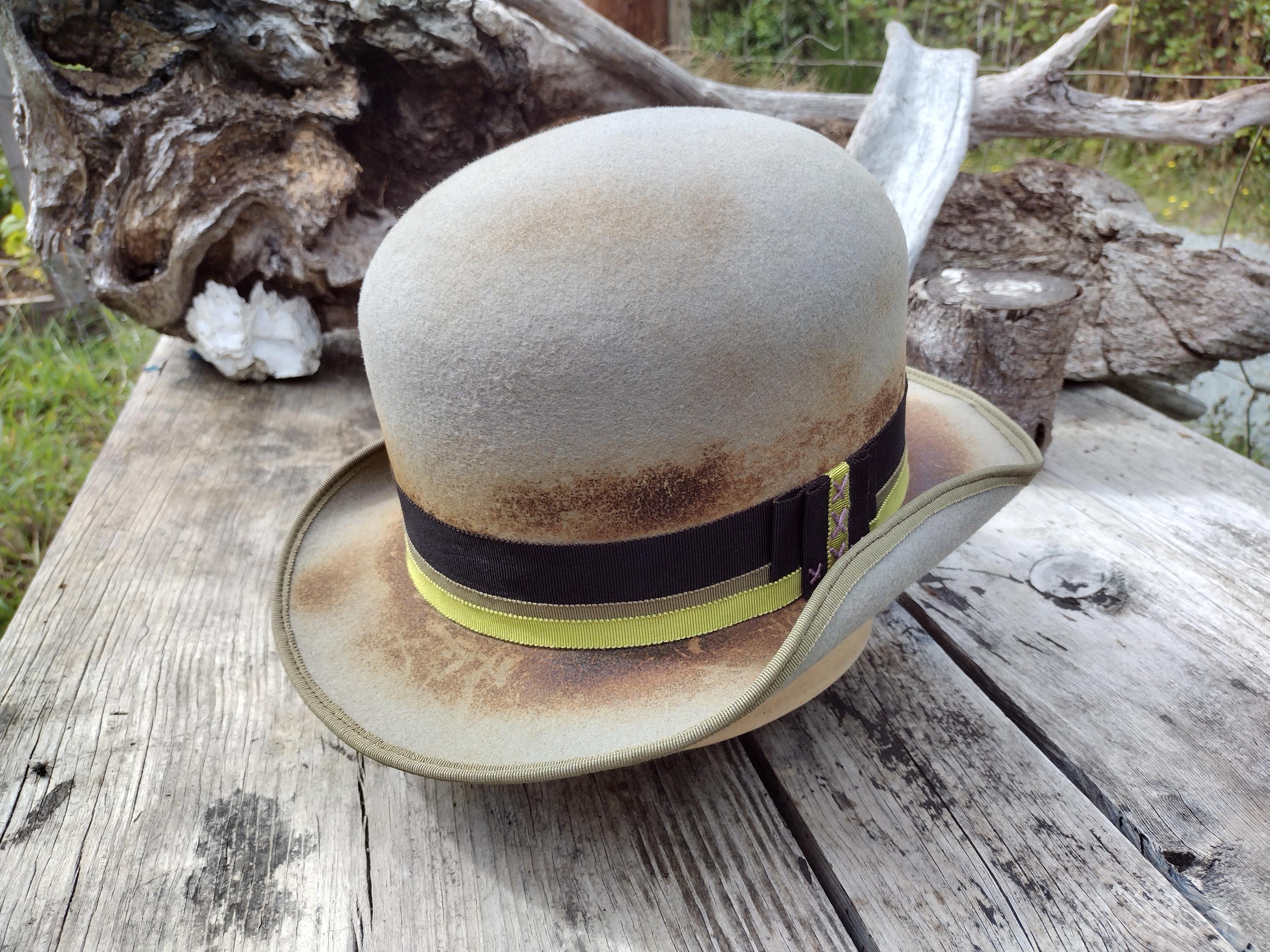 https://www.youtube.com/@hurleyhatworksMy "Grungy Bowler" hat in light grey. Thick wool felt hand blocked and shaped by me. triple layered grosgrain ribbons for the hat band and olive green for the brim binding. Calf skin inner sweatband with a black Paisley cotton liner. The crown height is 5 1/2" and the brim is 1 7/8".