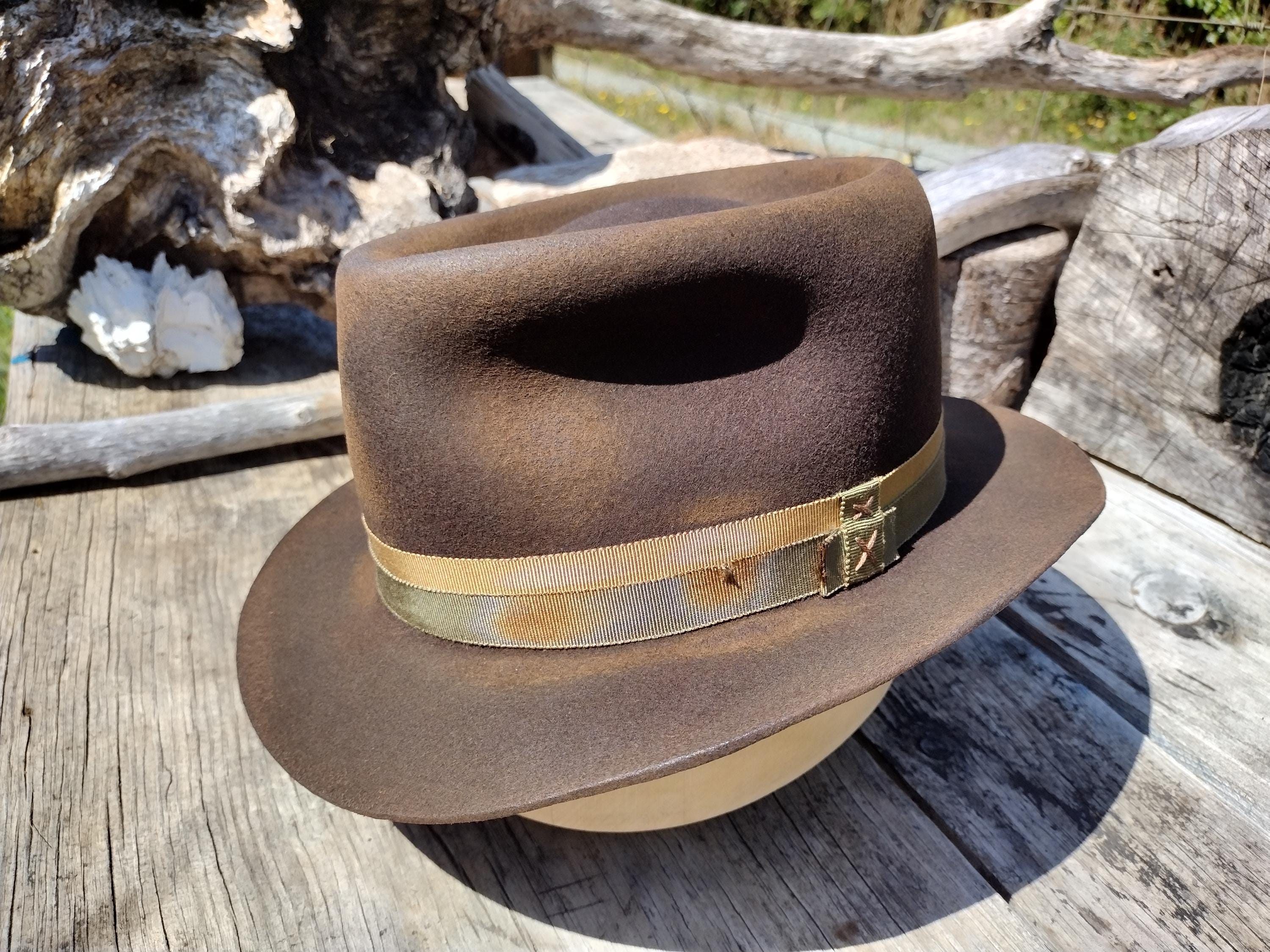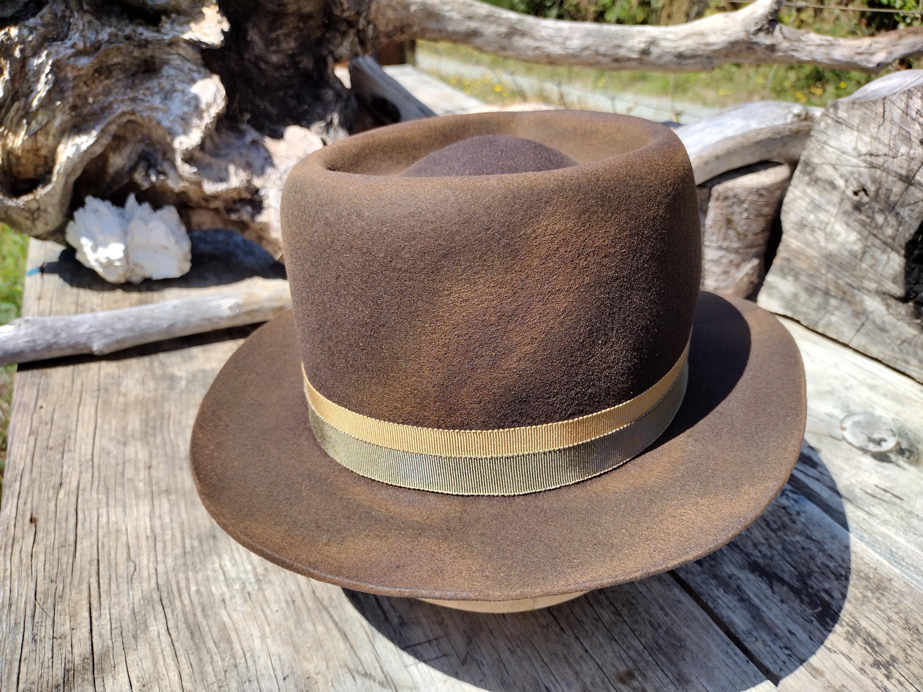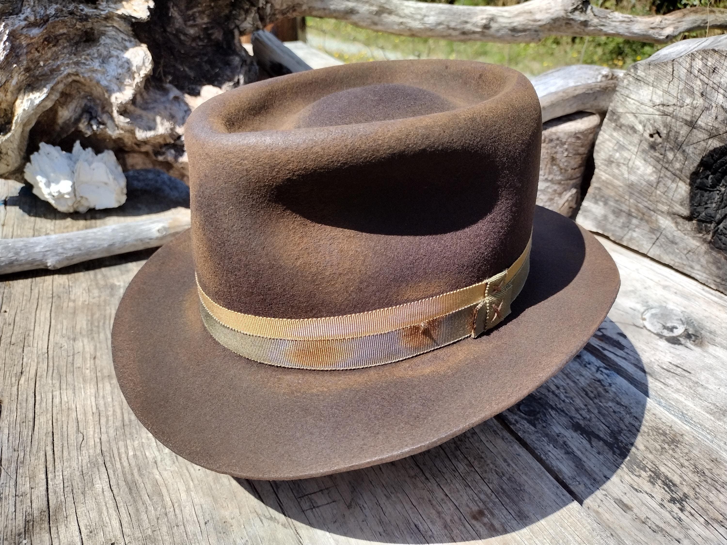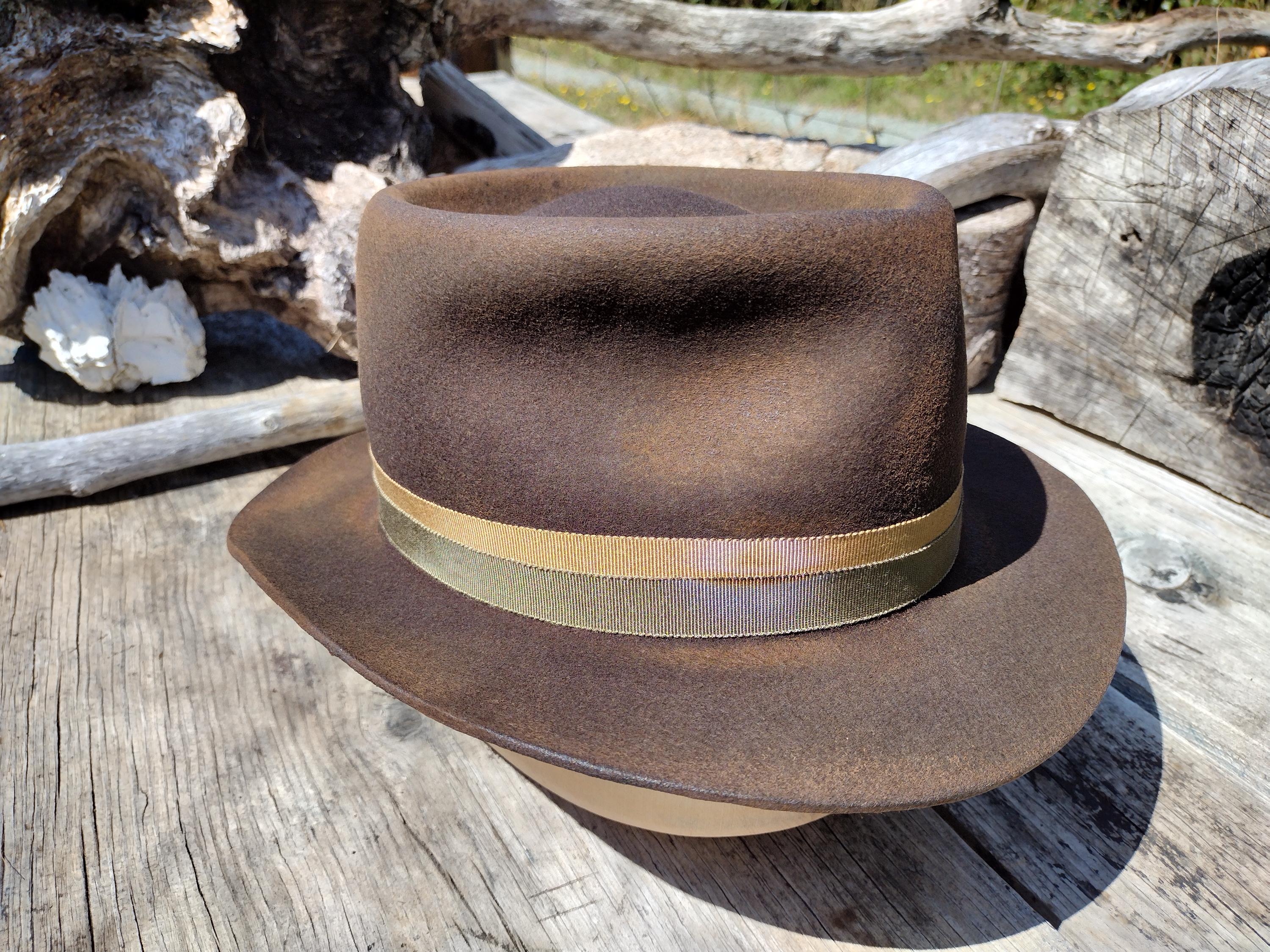 https://www.youtube.com/@hurleyhatworksMy "Grubby Fedora" hat in brown. Thick wool felt hand blocked and shaped by me. Layered cotton grosgrain ribbons for the hat band with a raw edge brim. Calf skin inner sweatband with a cotton liner. The crown height is 5" and the brim is 1 7/8".
