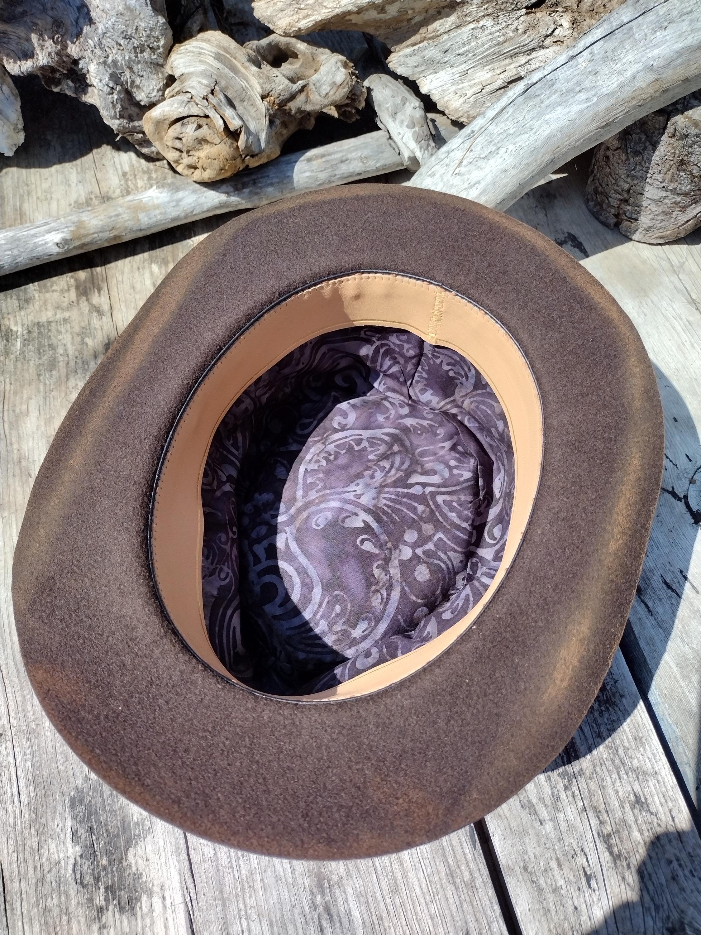 All my hats are made from either wool, rabbit or beaver felts. I use all cotton or linen for the thread, ribbon and brim bindings. I use reeded leather sweatbands for a very comfortable and durable fit.