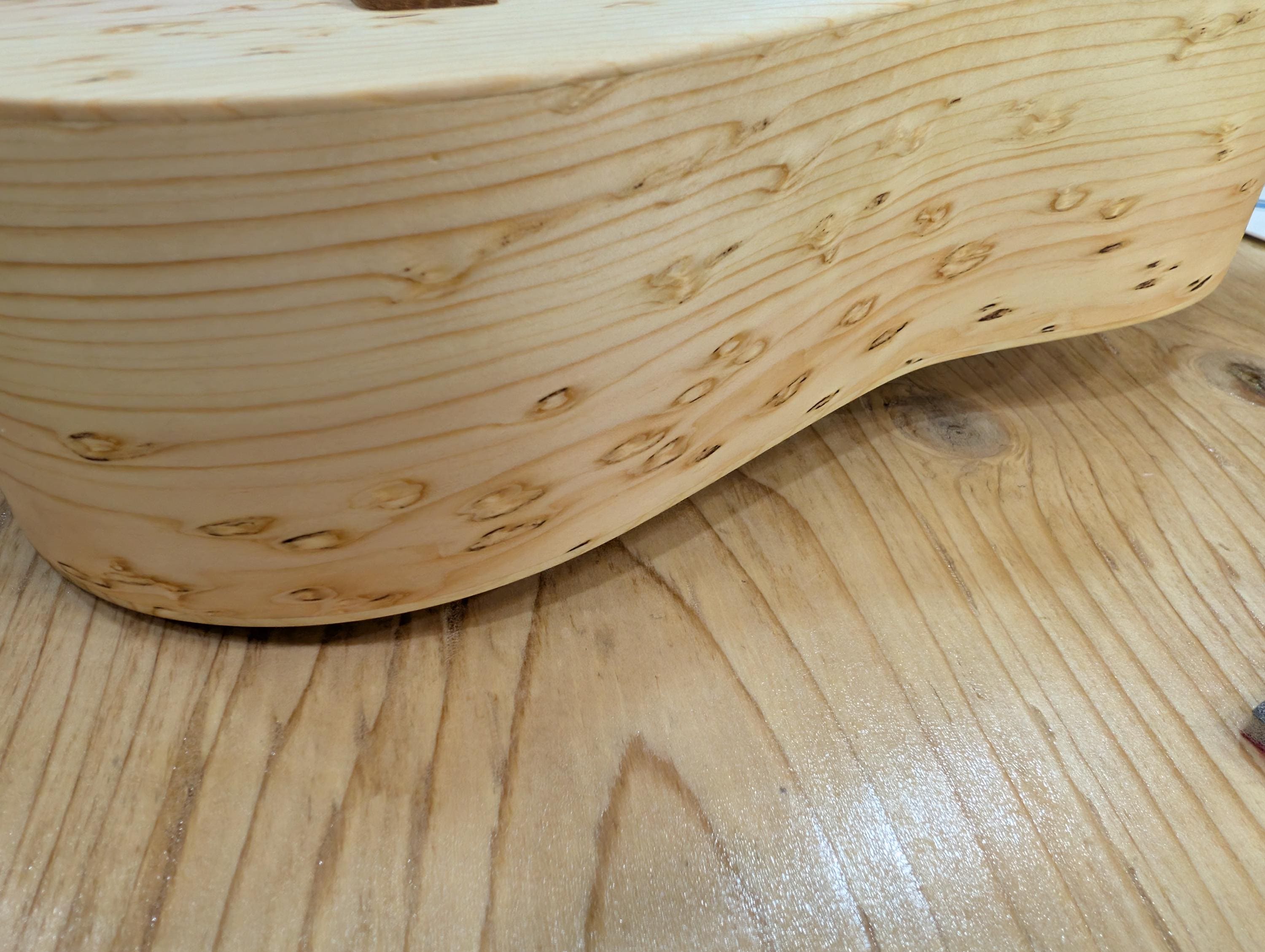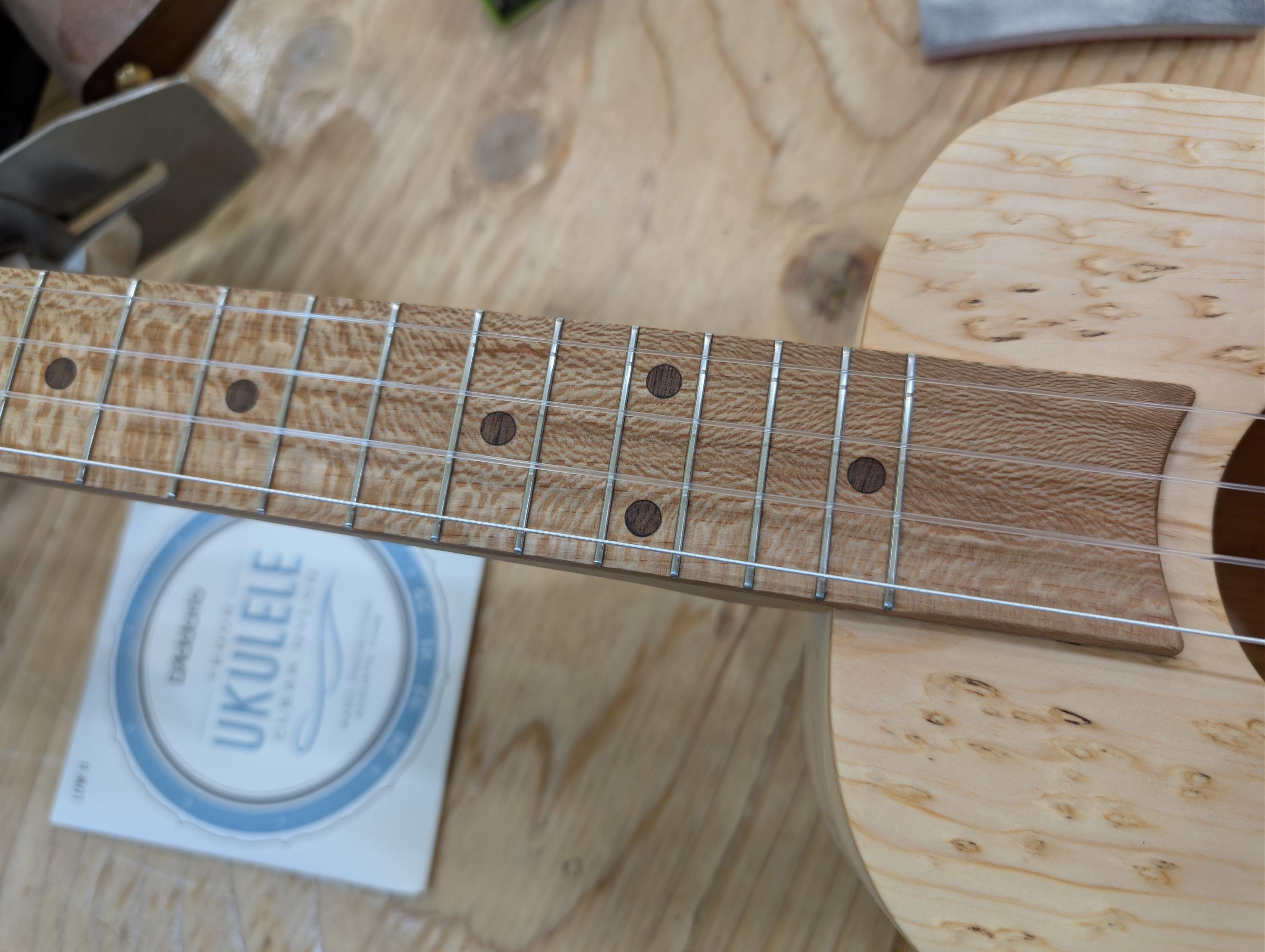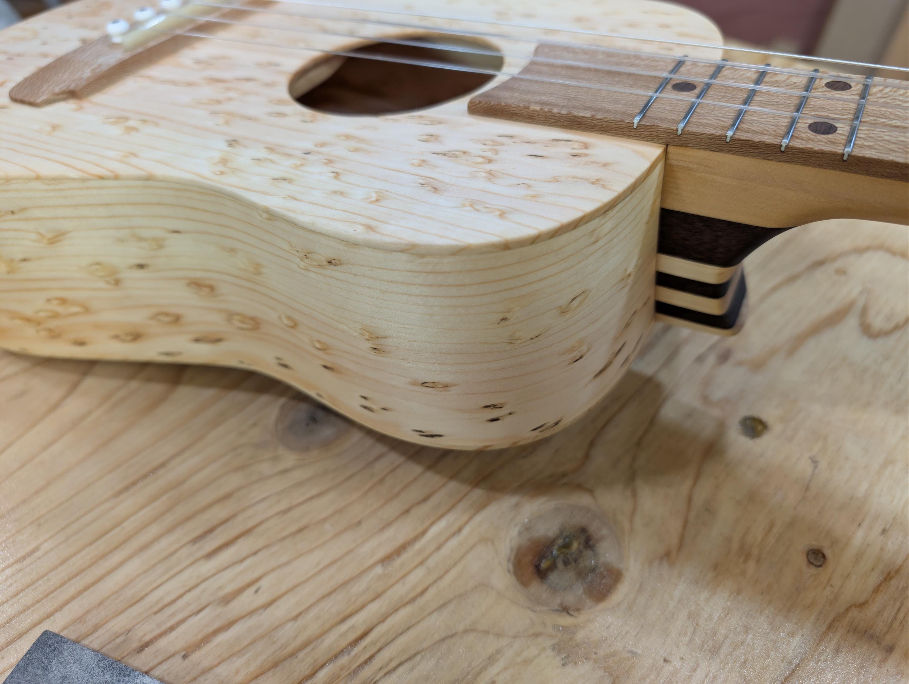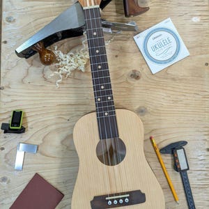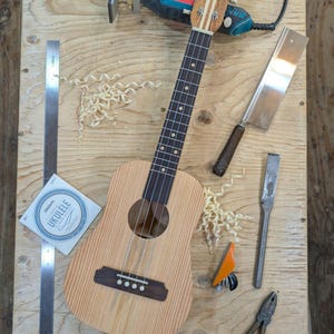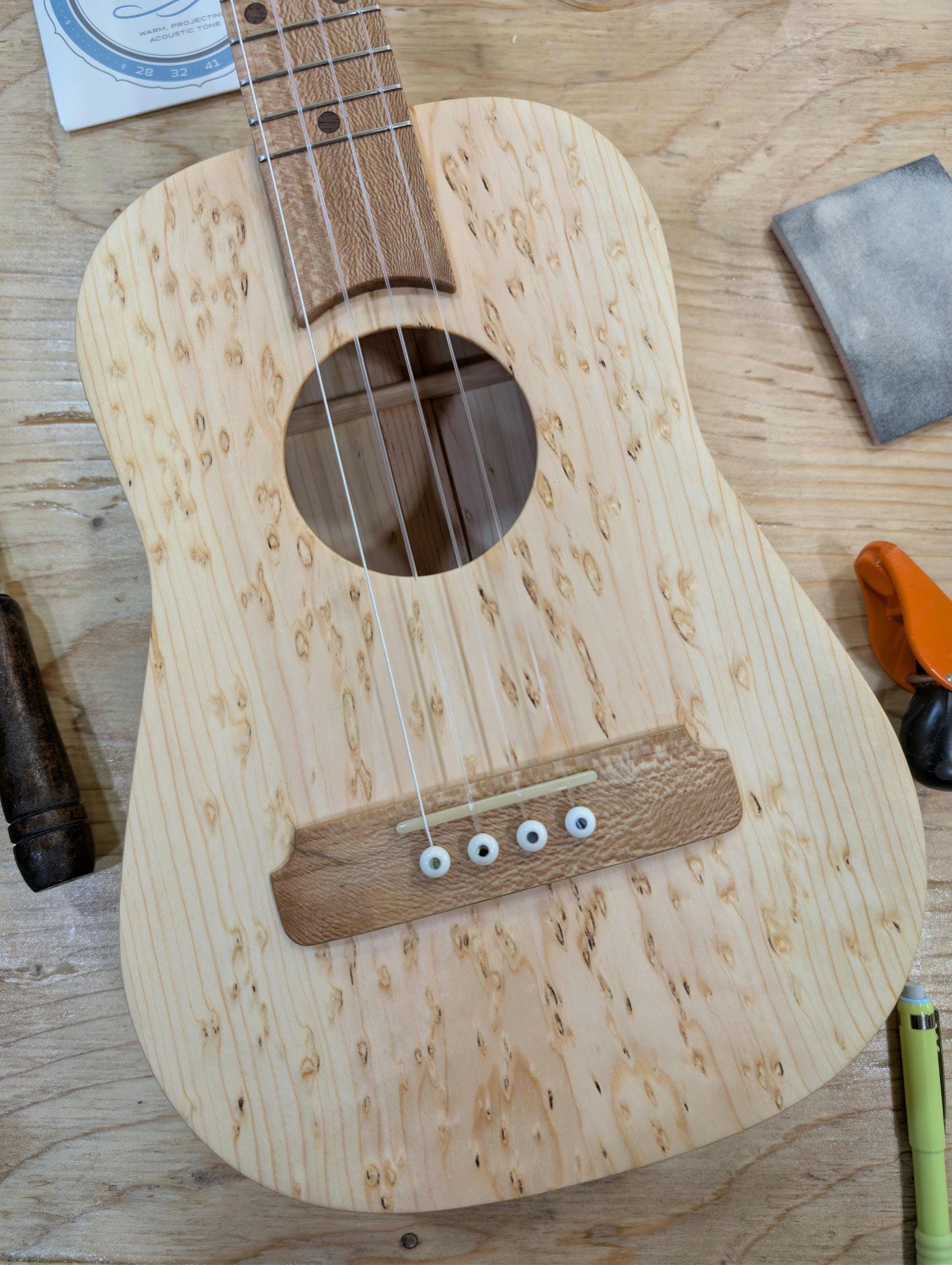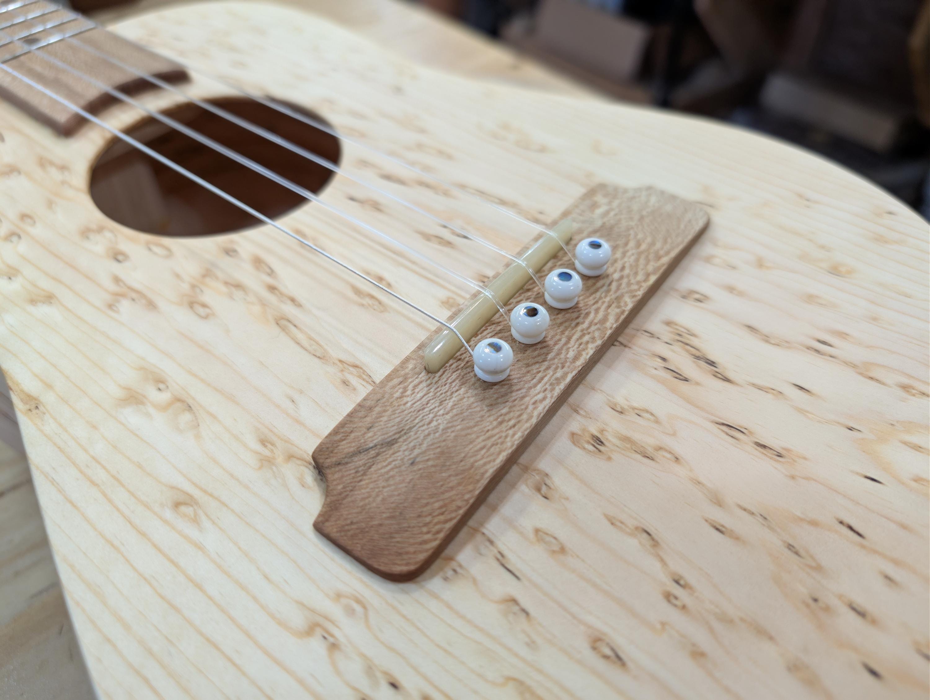 Top wood : Spotted pine Back wood : Spotted pine Sides : Spotted pine Fretboard : Sycamore with Walnut fret dots Bridge : Sycamore nut width : 1.47" width at 12th fret : 1.69" string spacing at nut : .375" scale length: 17" The neck is made or Port Orford cedar with layers of Walnut and Hard Maple in the center. The headstock inlay is mahogany nut and saddle are unbleached bone bridge pins are bone with inlays golden gate tuning machines D'Addario clear nylon low G strings