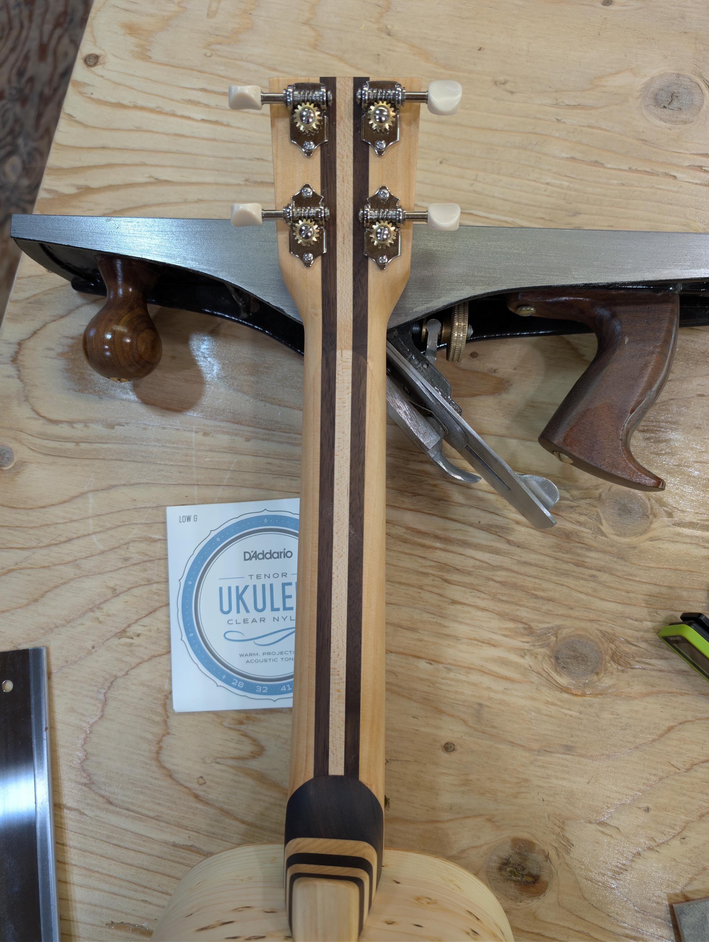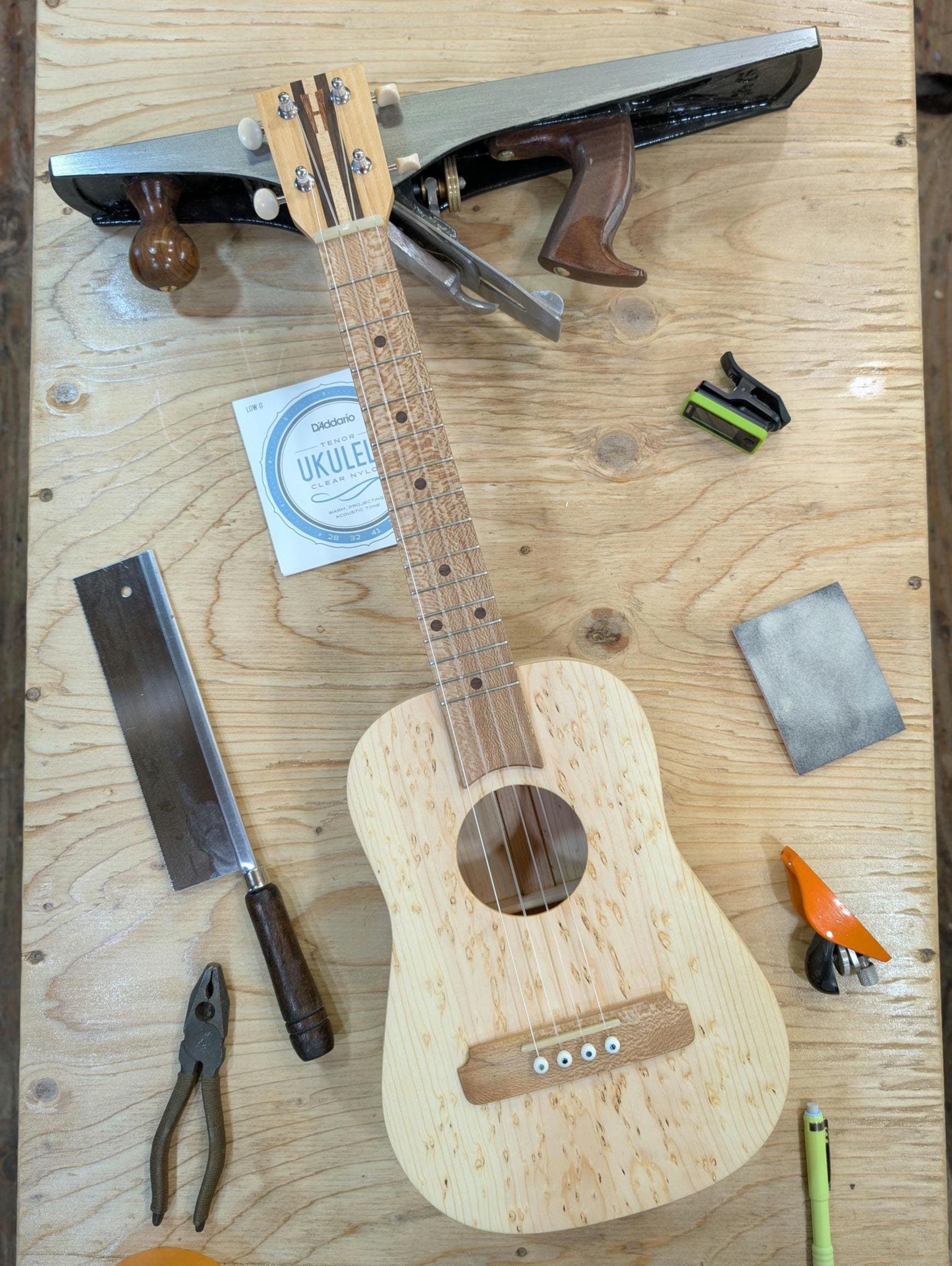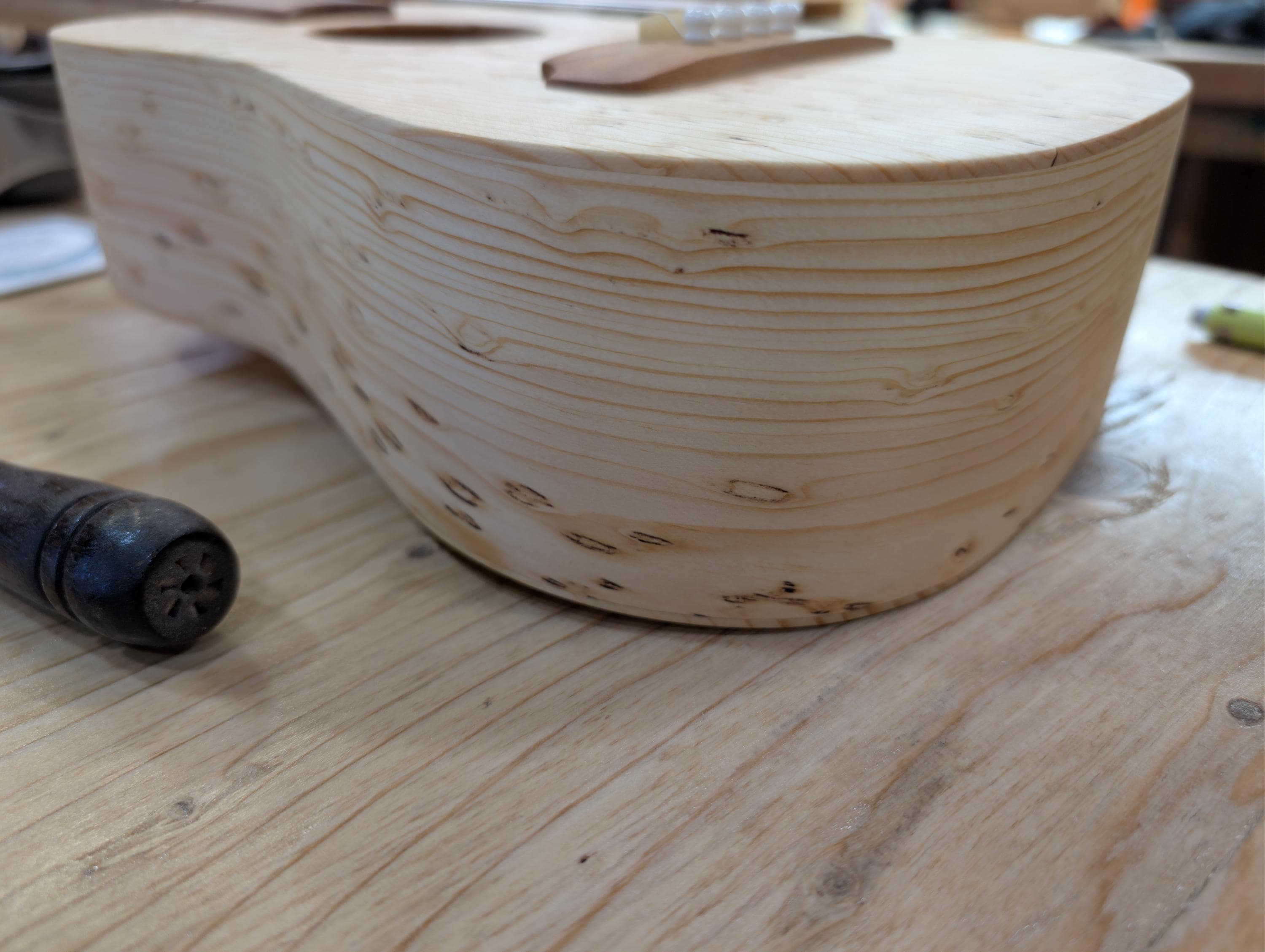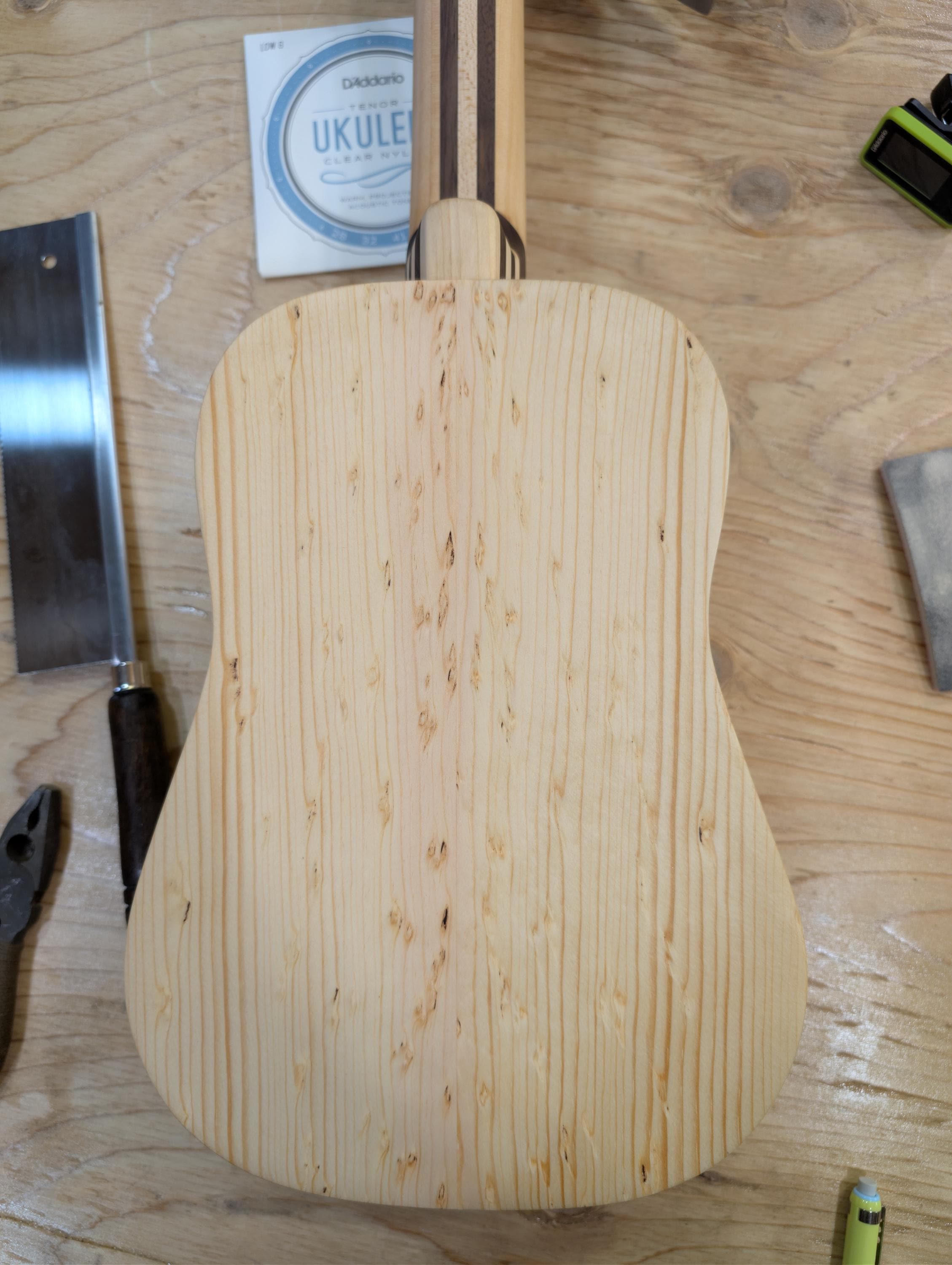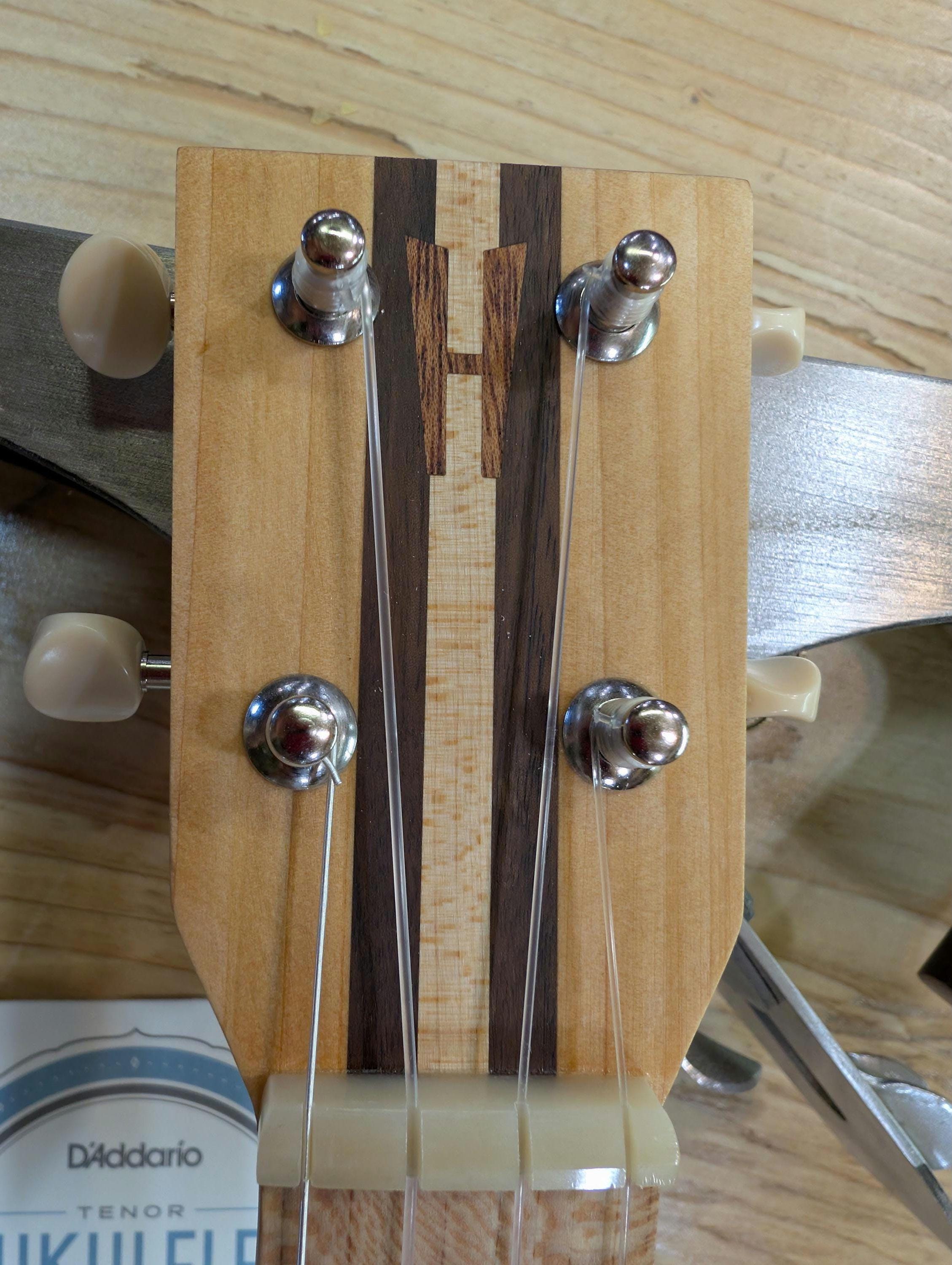 Top wood : Spotted pine Back wood : Spotted pine Sides : Spotted pine Fretboard : Sycamore with Walnut fret dots Bridge : Sycamore nut width : 1.47" width at 12th fret : 1.69" string spacing at nut : .375" scale length: 17" The neck is made or Port Orford cedar with layers of Walnut and Hard Maple in the center. The headstock inlay is mahogany nut and saddle are unbleached bone bridge pins are bone with inlays golden gate tuning machines D'Addario clear nylon low G strings