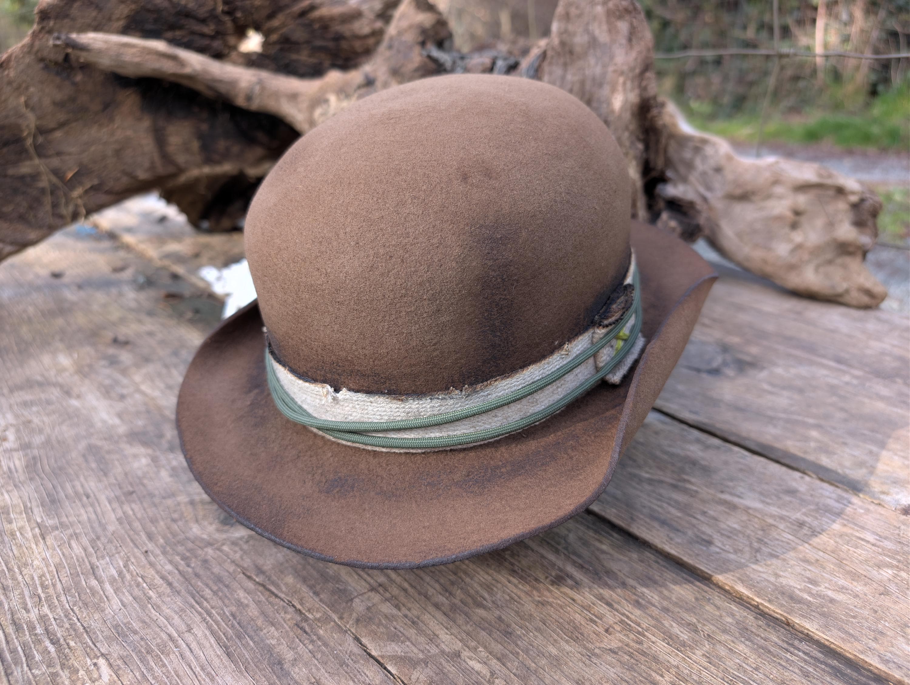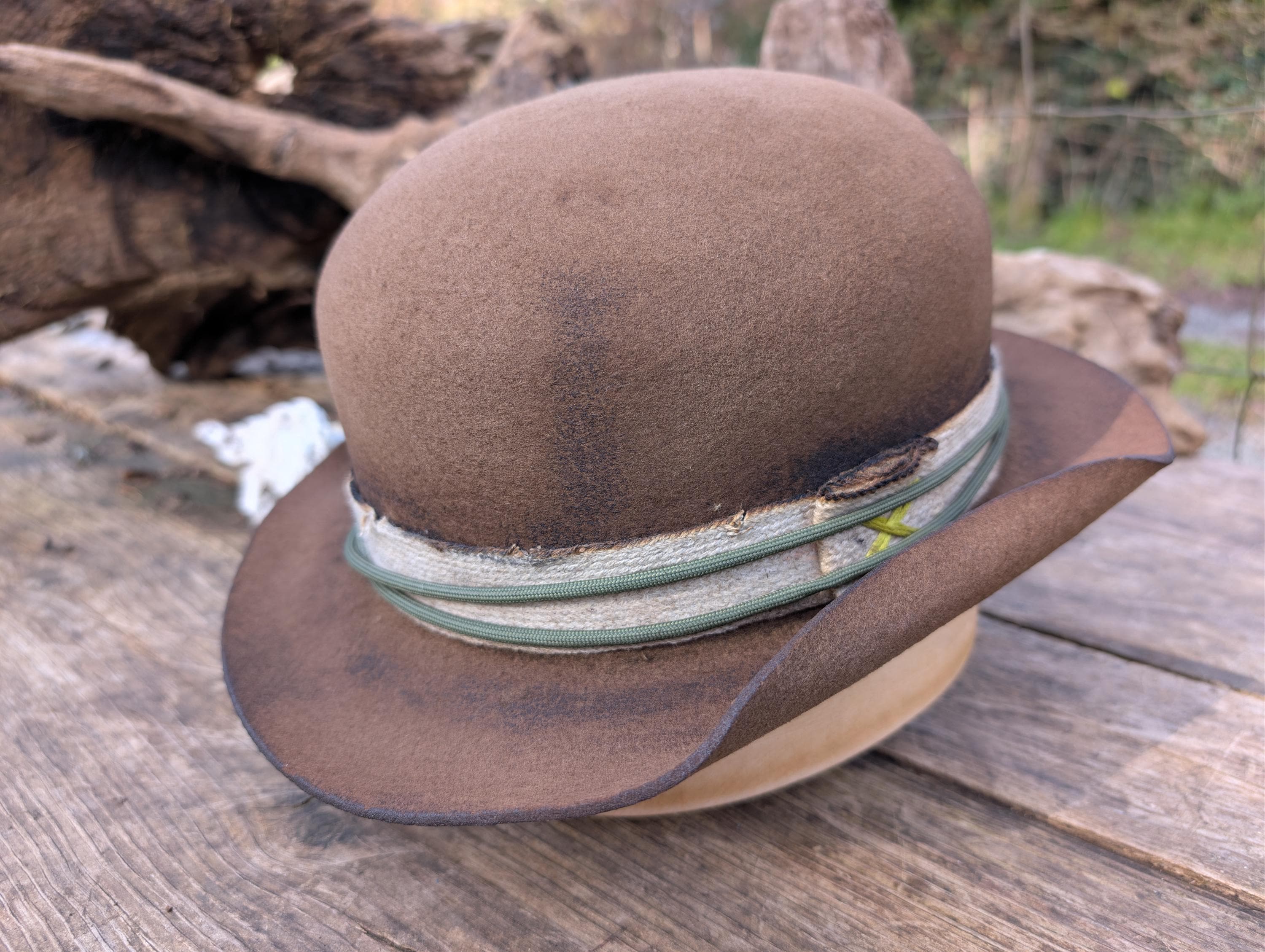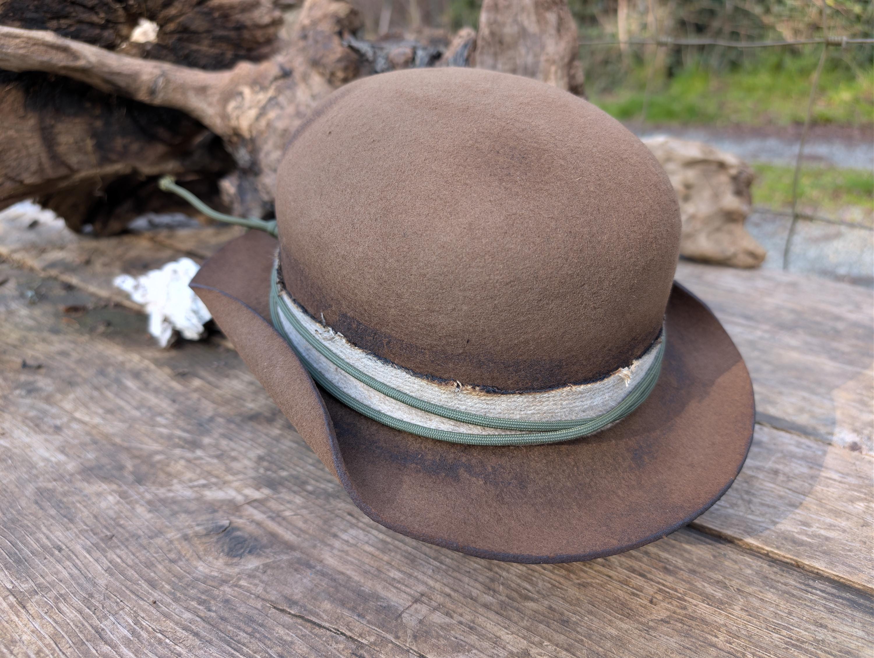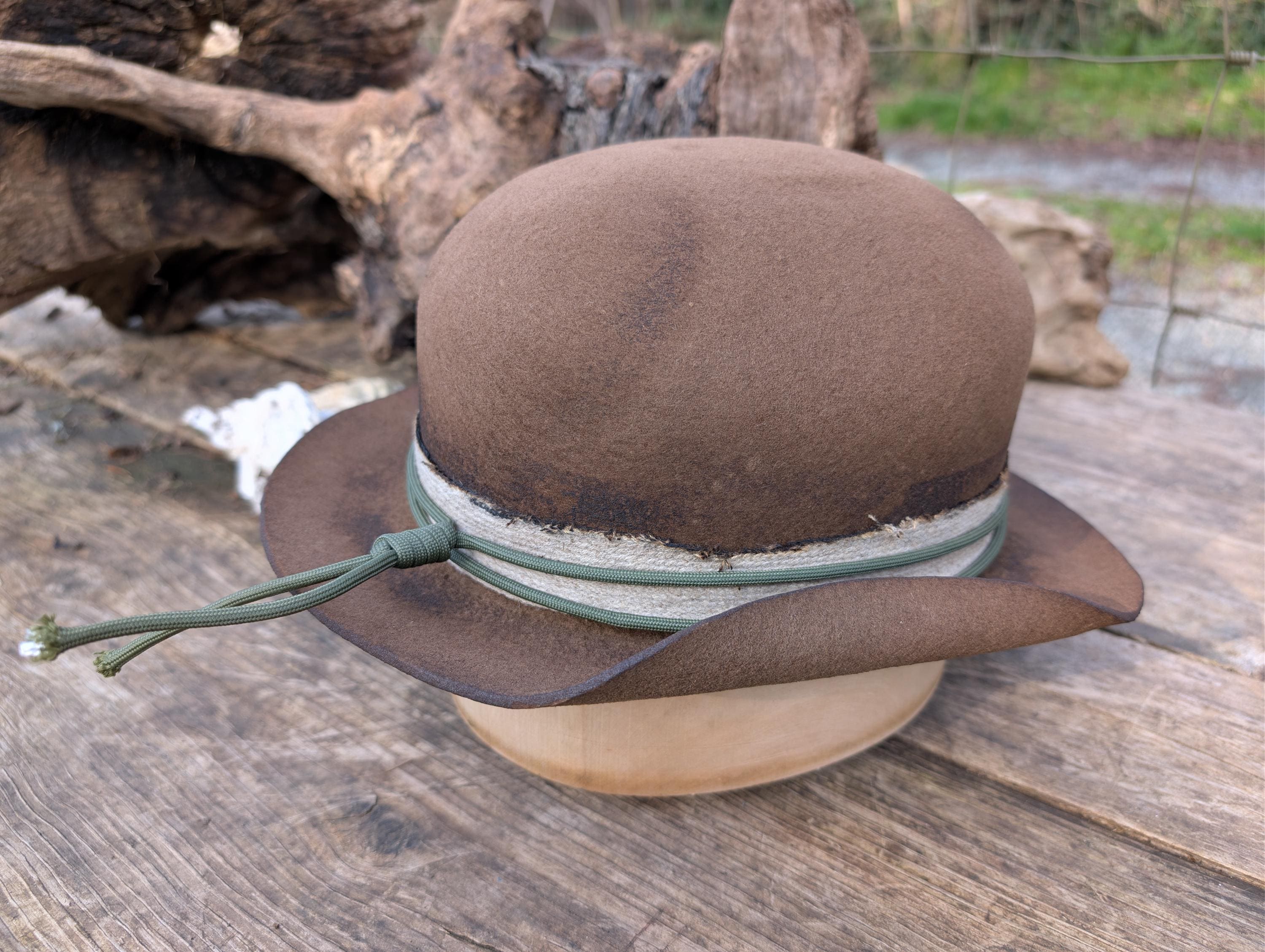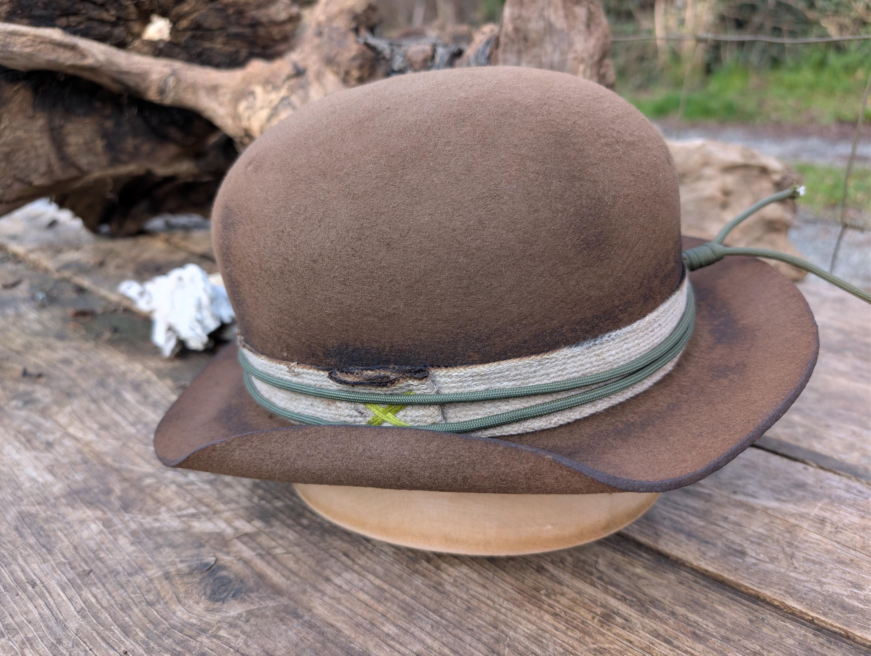 https://www.youtube.com/@hurleyhatworksThe "Archer" distressed bowler hat in brown. Thick wool felt hand blocked and shaped by me. Burned cotton ribbon hat band with paracord for the hat band. Calf skin inner sweatband with a Red Paisley cotton liner. The crown height is 4 3/4" and the brim is 1 7/8".