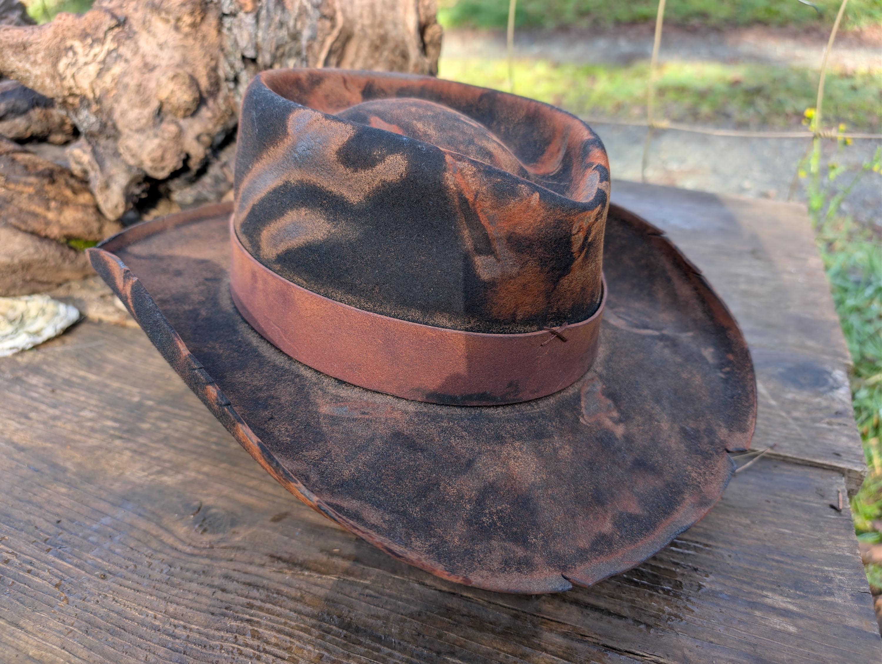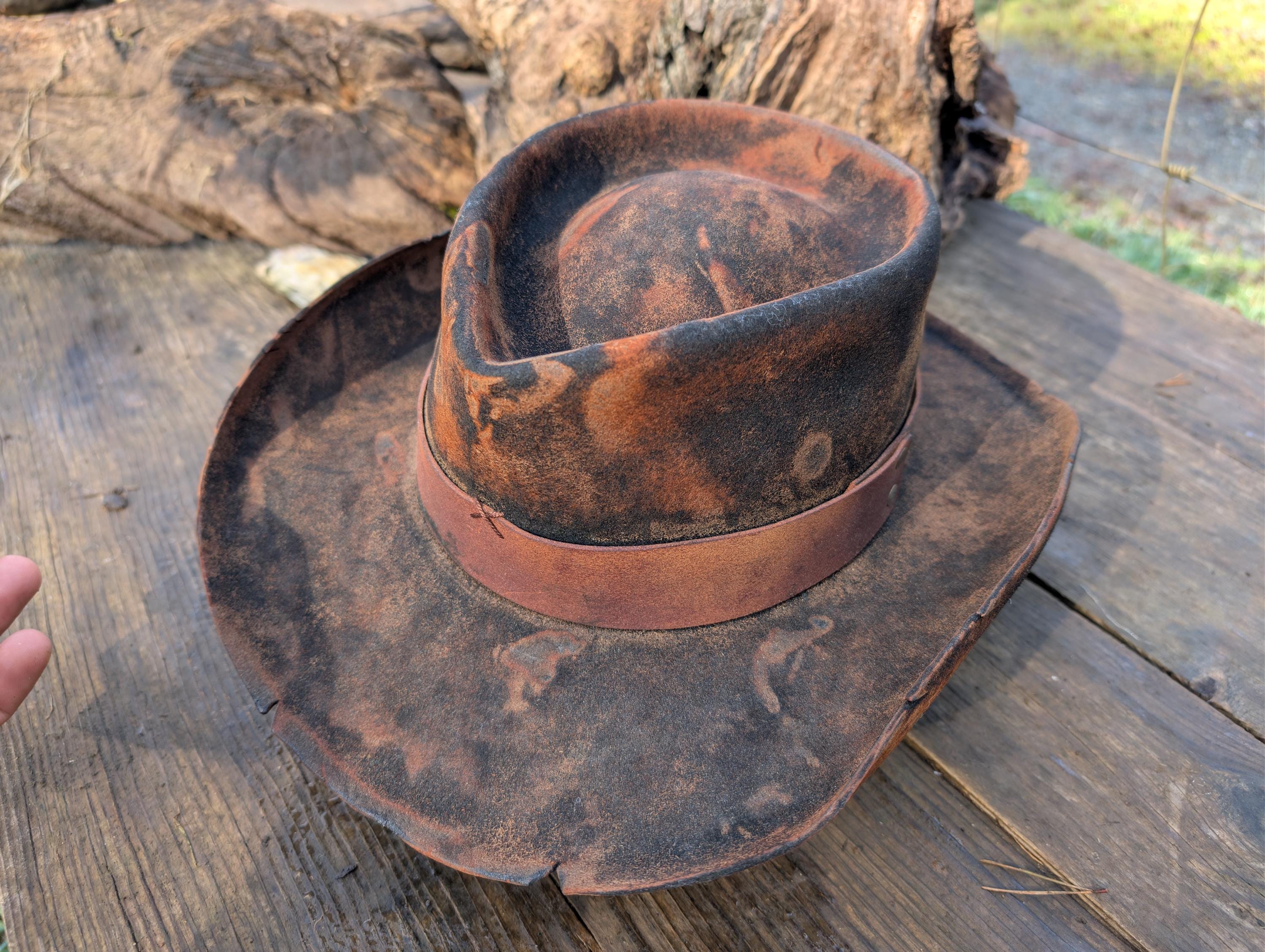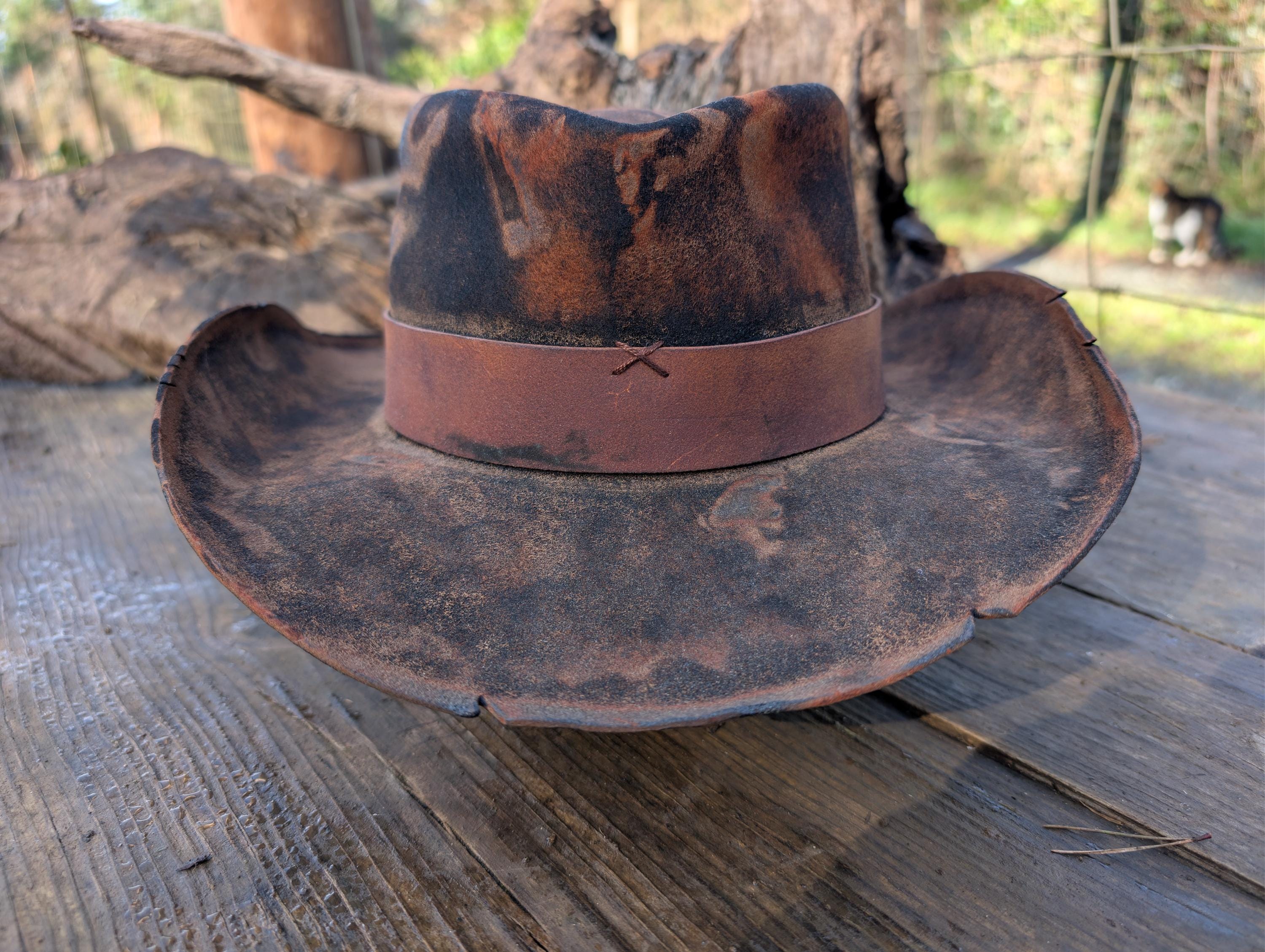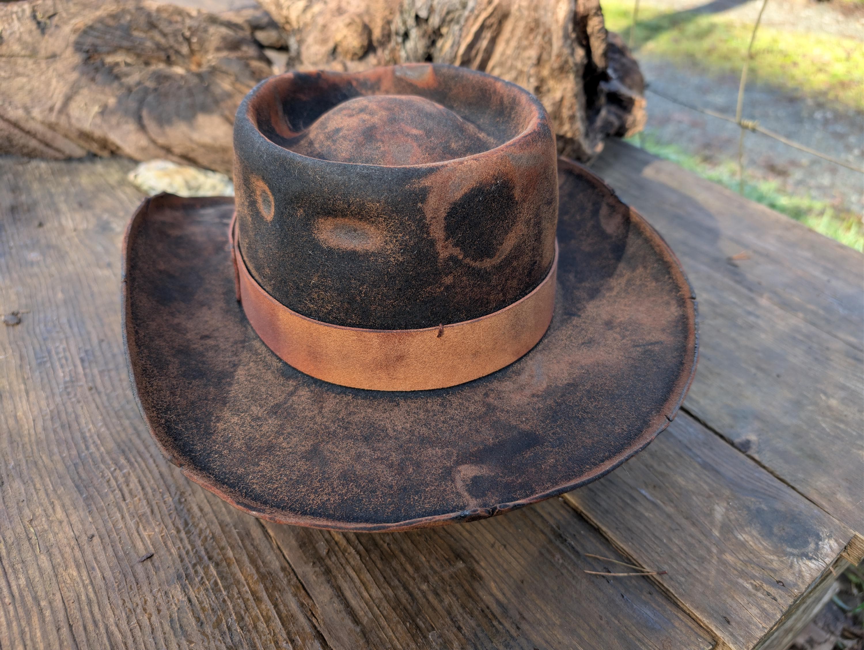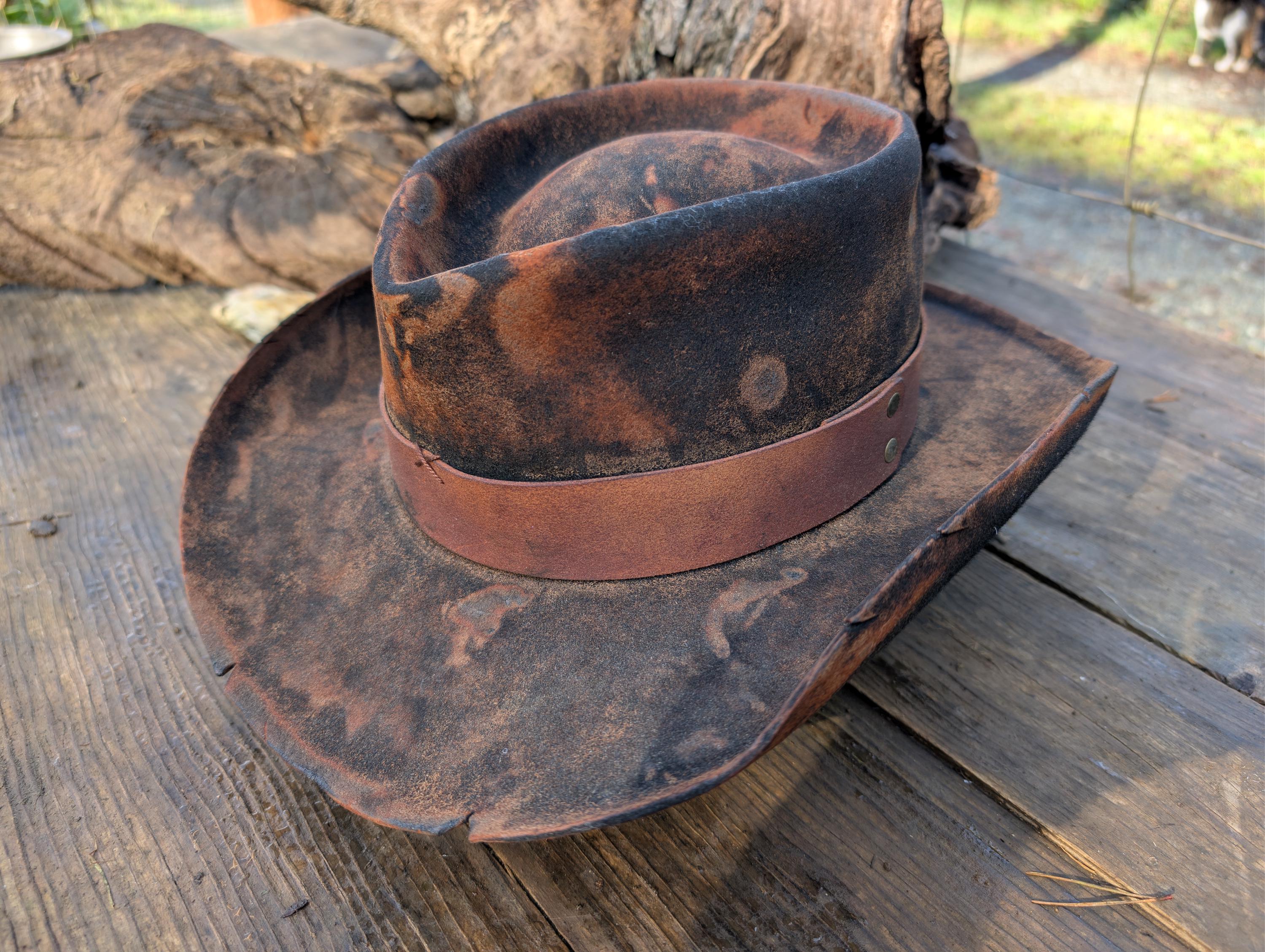 https://www.youtube.com/@hurleyhatworksDistressed western hat in black. Thick wool felt hand blocked and shaped by me. Veg tan leather hat band . Calf skin inner sweatband with a cotton liner. The crown height is 4 1/4" and the brim is 3".